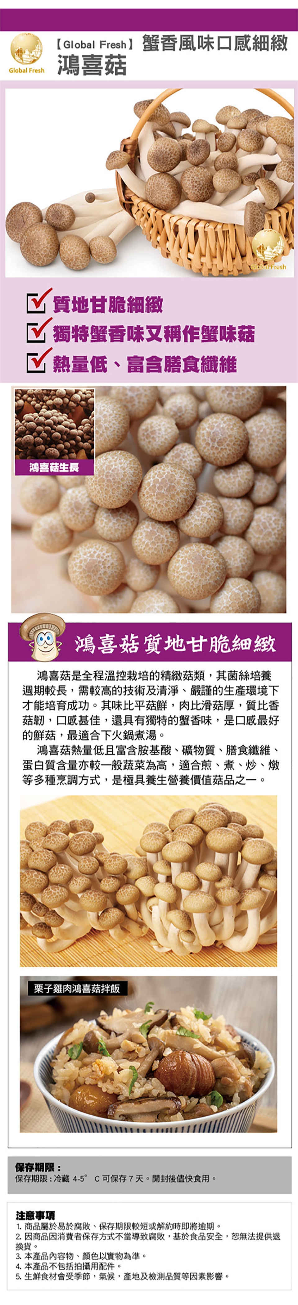 鴻喜菇質地甘脆細緻,是全程溫控栽培的精緻菇類,其菌絲培養週期較長,需較高的技術及清淨、嚴謹的生產環境下才能培育成功。