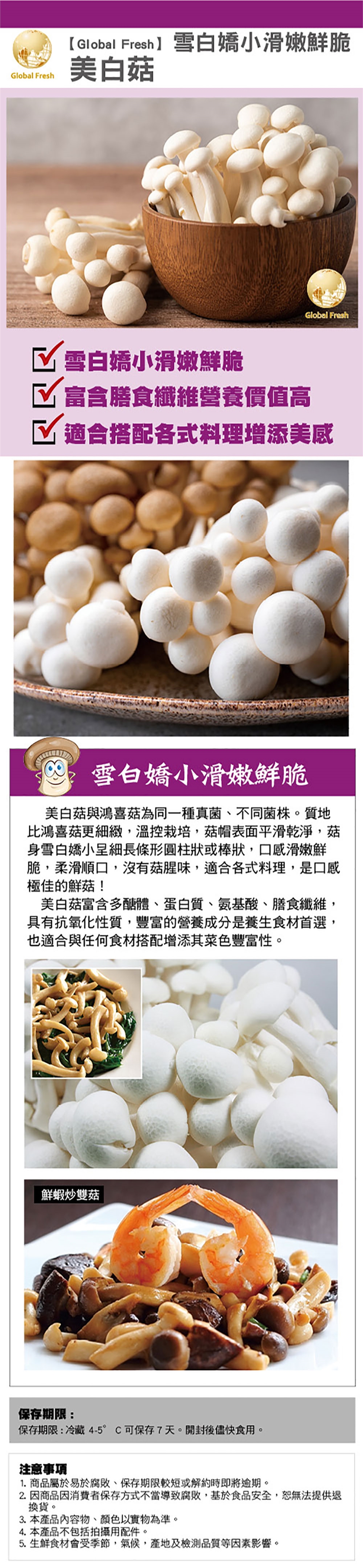 菇身雪白嬌小呈細長條形圓柱狀或棒狀,口感滑嫩鮮脆,柔滑順口,沒有菇腥味,適合各式料理,是口感極佳的鮮菇!