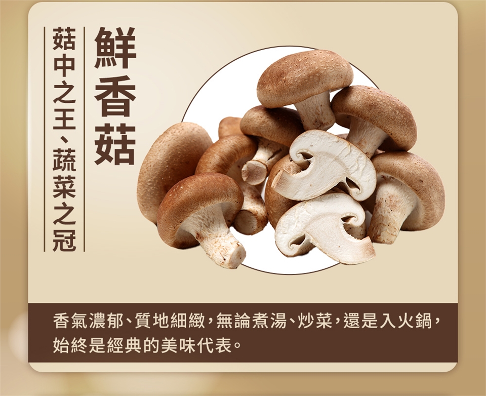 菇中之王、蔬菜之冠鮮香菇 : 香氣濃郁、質地細緻,無論煮湯、炒菜,還是入火鍋,始終是經典的美味代表。
