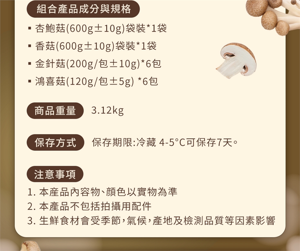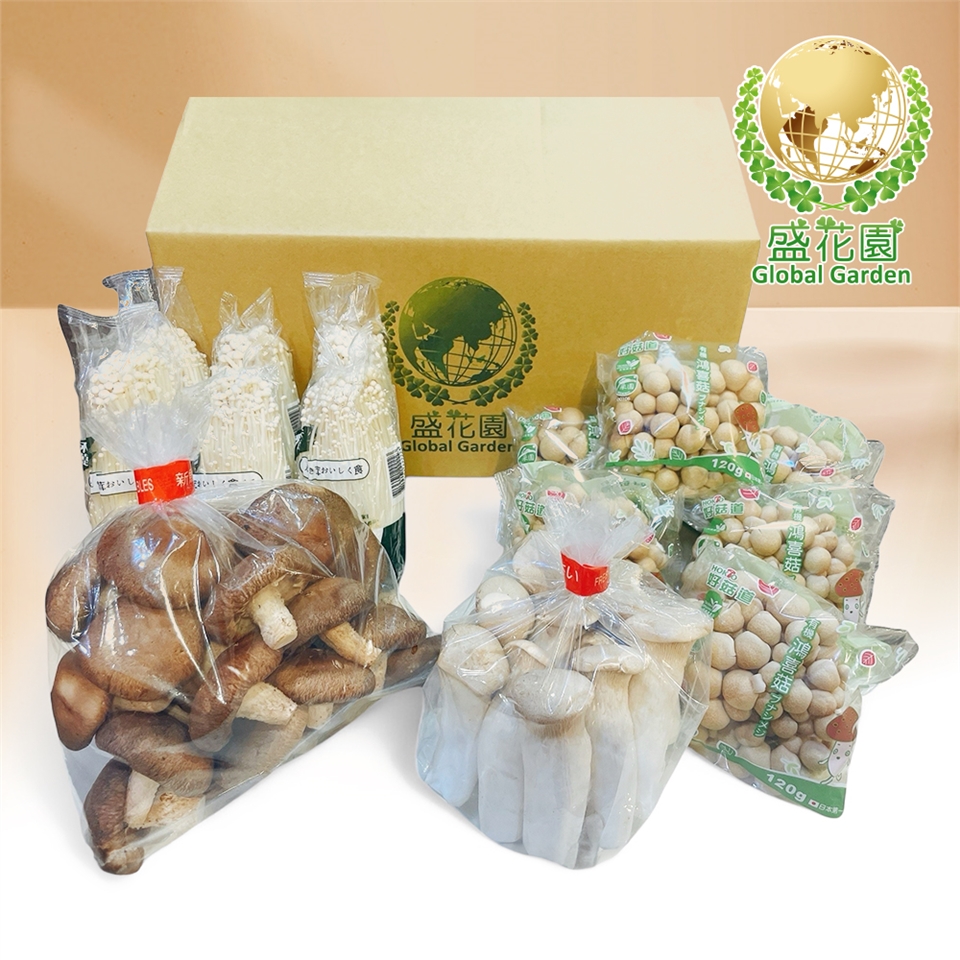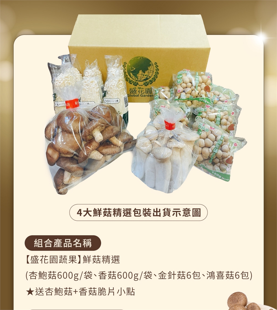 (杏鮑菇600g/袋、香菇600g/袋、金針菇200g/包,共6包、鴻喜菇120g/包,共6包)