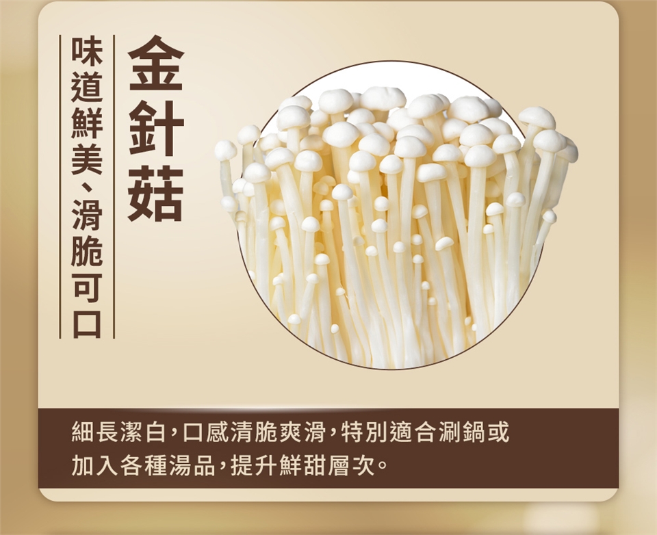 味道鮮美、滑脆可口金針菇 : 細長潔白,口感清脆爽滑,特別適合涮鍋或加入各種湯品,提升鮮甜層次。