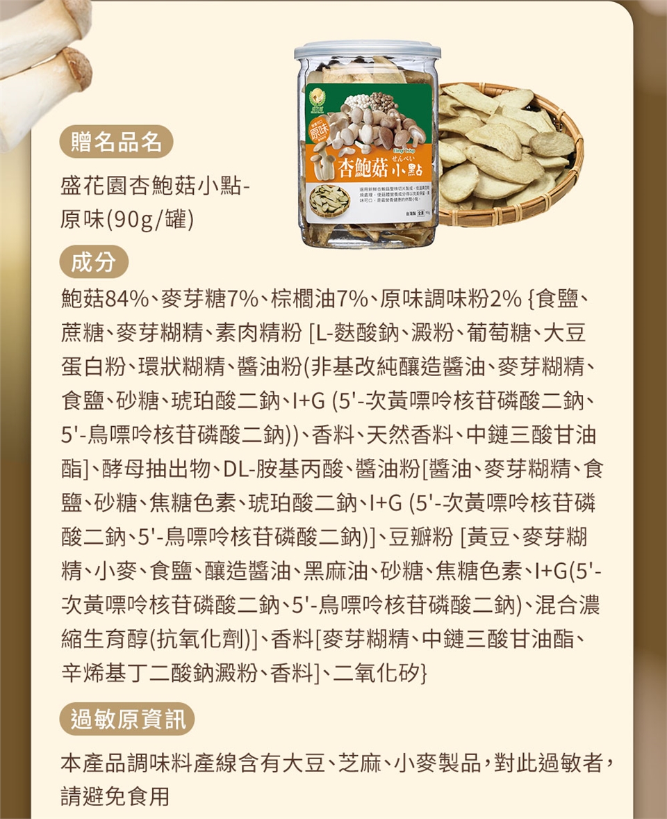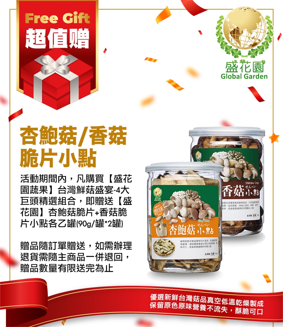 贈品【盛花園】杏鮑菇小點1罐(90g)、香菇脆片小點1罐(90g)