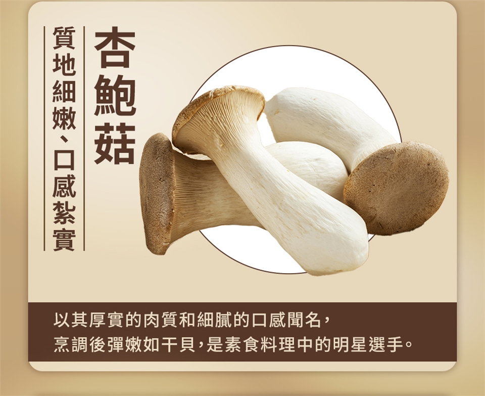 質地細嫩、口感紮實杏鮑菇 : 以其厚實的肉質和細膩的口感聞名,烹調後彈嫩如干貝,是素食料理中的明星選手。