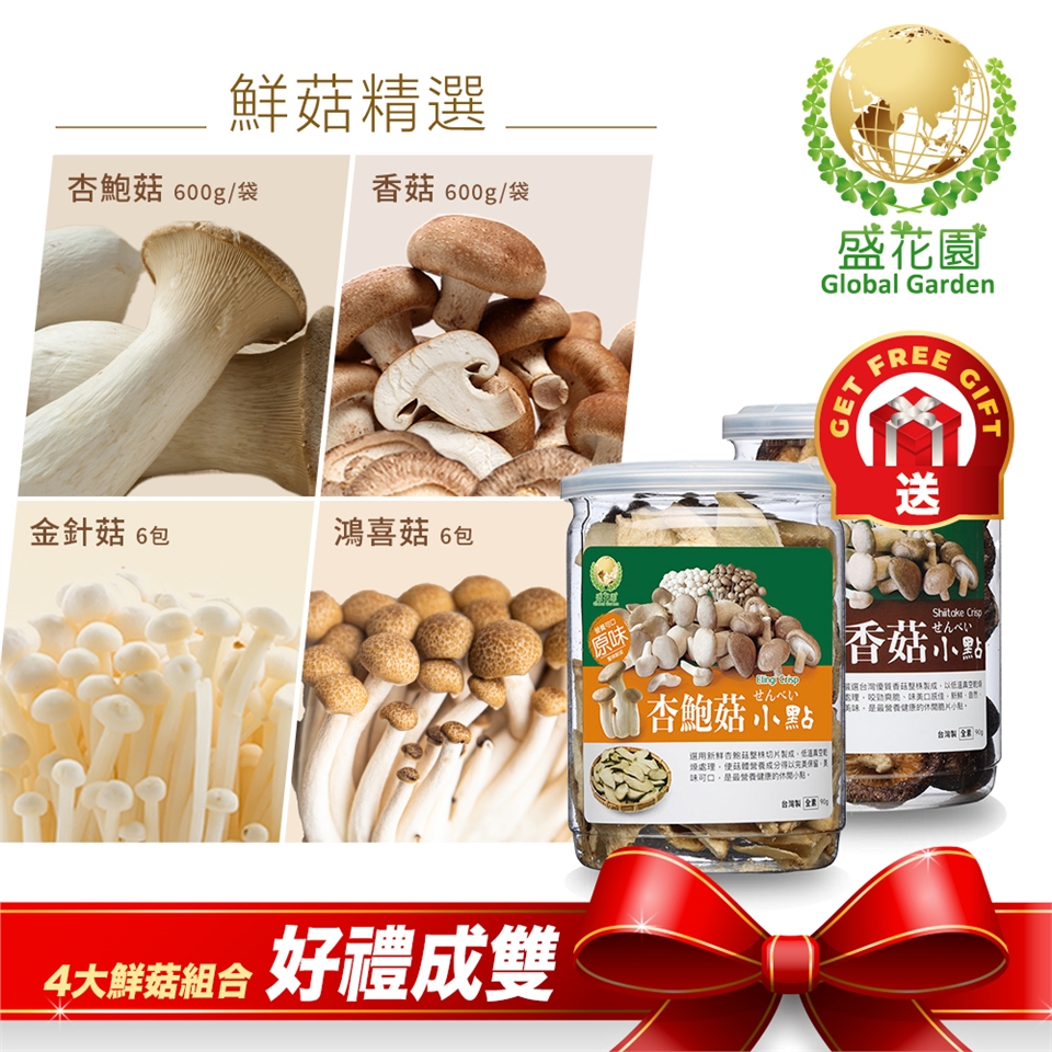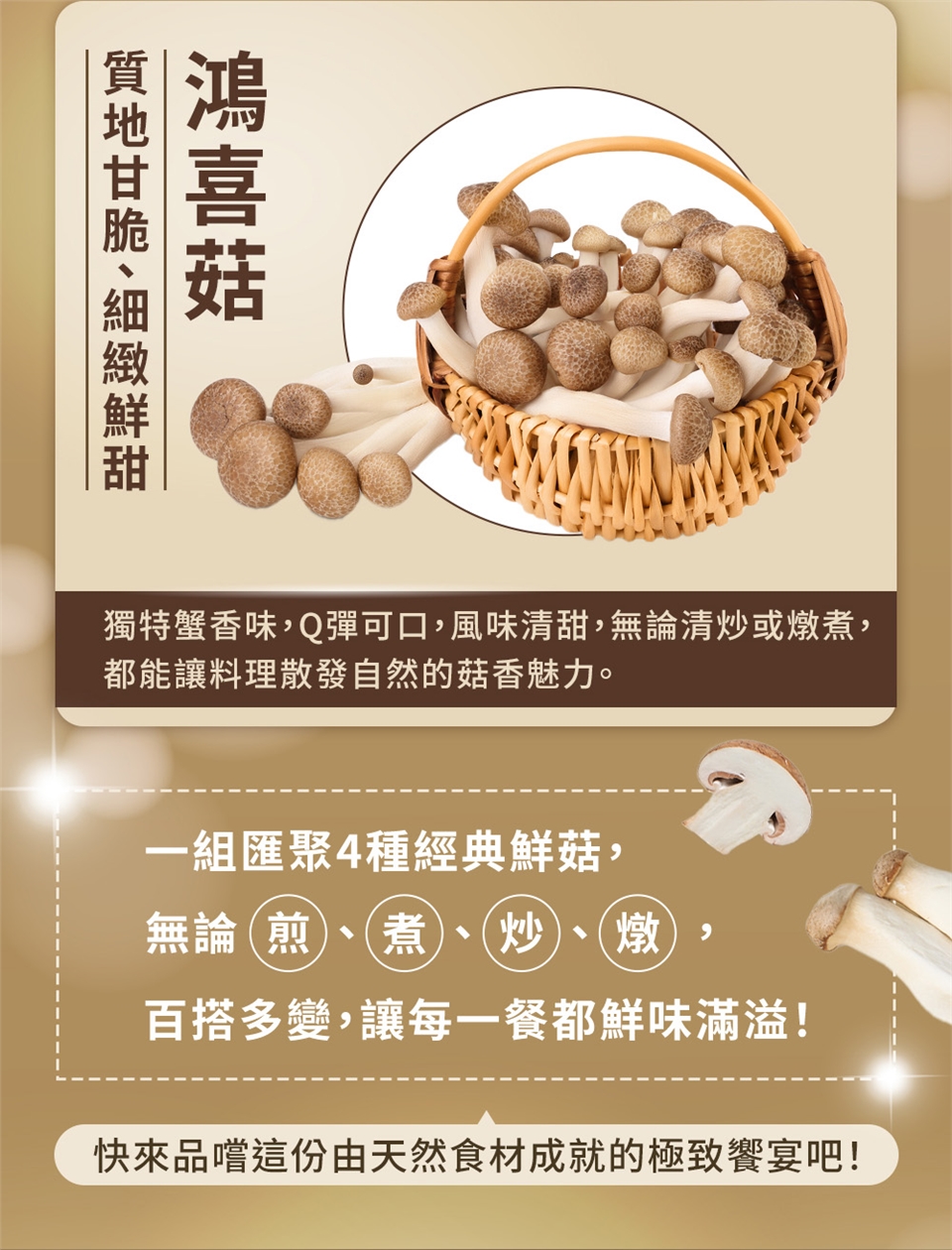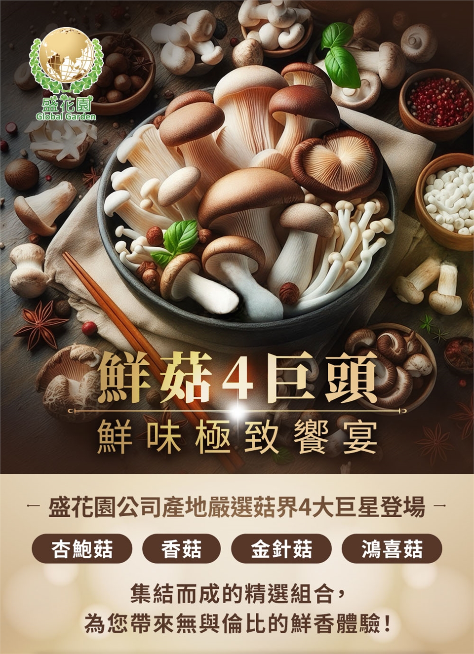 台灣鮮菇界的4大巨星登場-杏鮑菇、香菇、金針菇、鴻喜菇,集結而成的精選組合,為您帶來無與倫比的鮮香體驗!