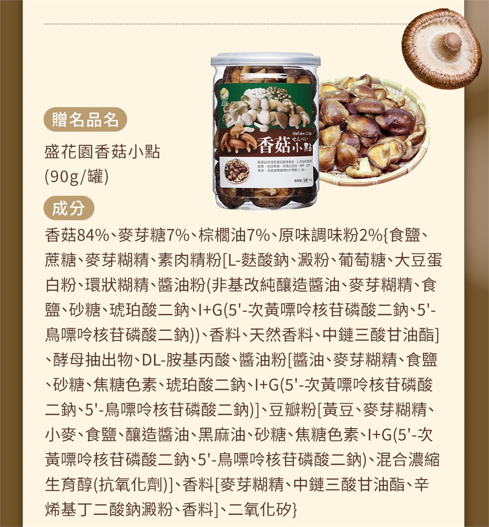 送杏鮑菇小點1罐(90g)、香菇脆片小點1罐(90g)