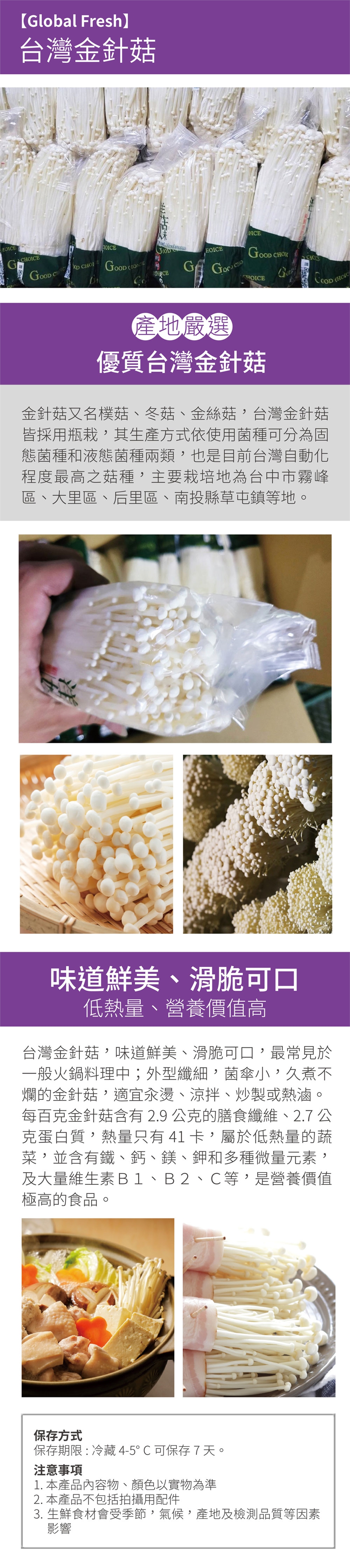 台灣金針菇,味道鮮美、滑脆可口,最常見於一般火鍋料理中;外型纖細,菌傘小,久煮不爛的金針菇,適宜汆燙、涼拌、炒製或熱滷。