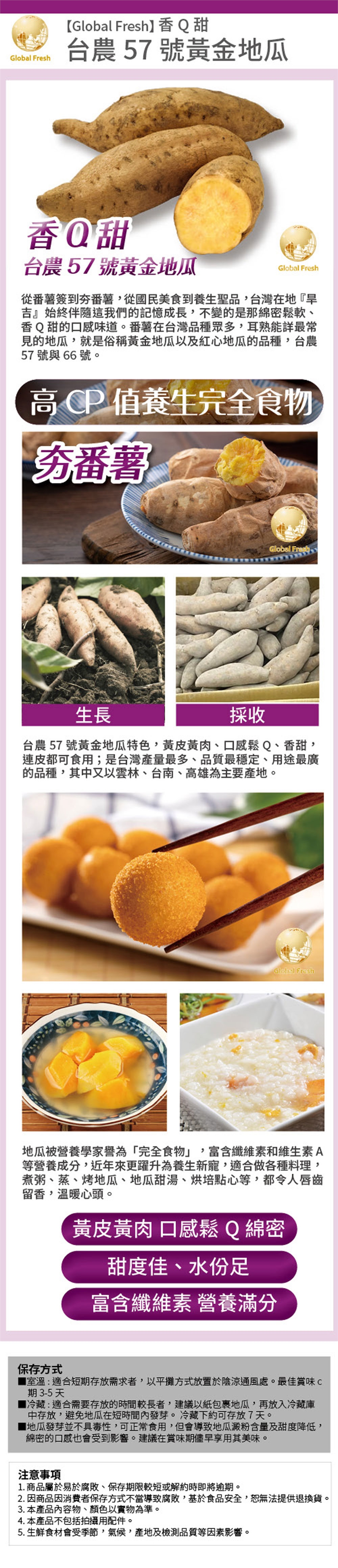 台農57號黃金地瓜特色,黃皮黃肉、口感鬆Q、香甜,連皮都可食用;是台灣產量最多、品質最穩定、用途最廣的品種,其中又以雲林、台南、高雄為主要產地。