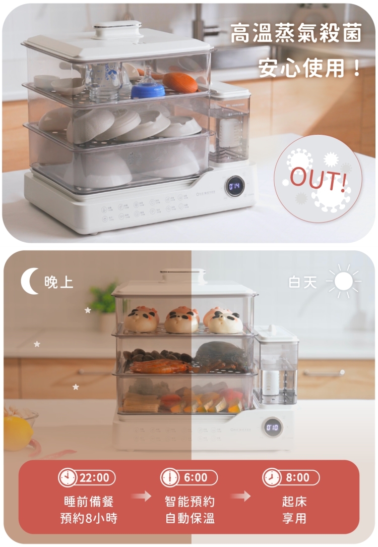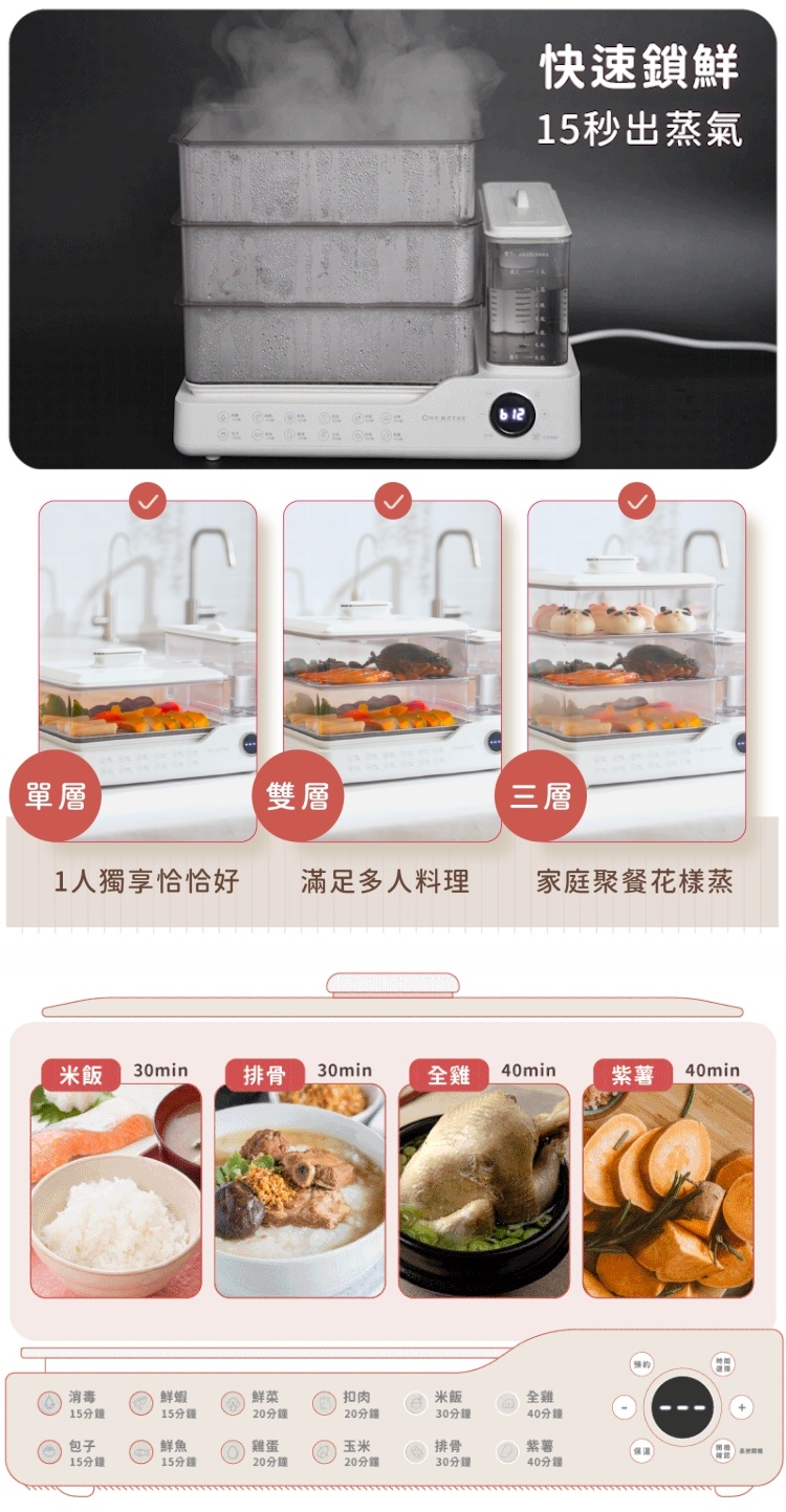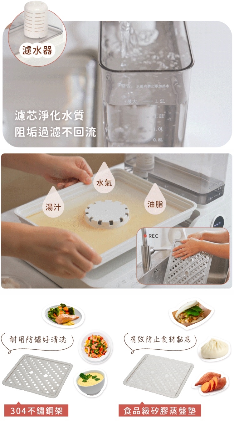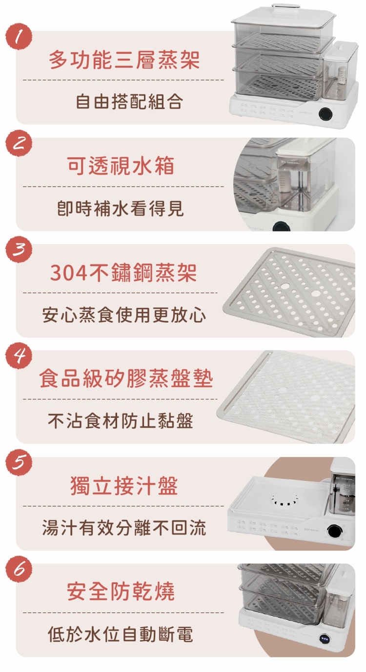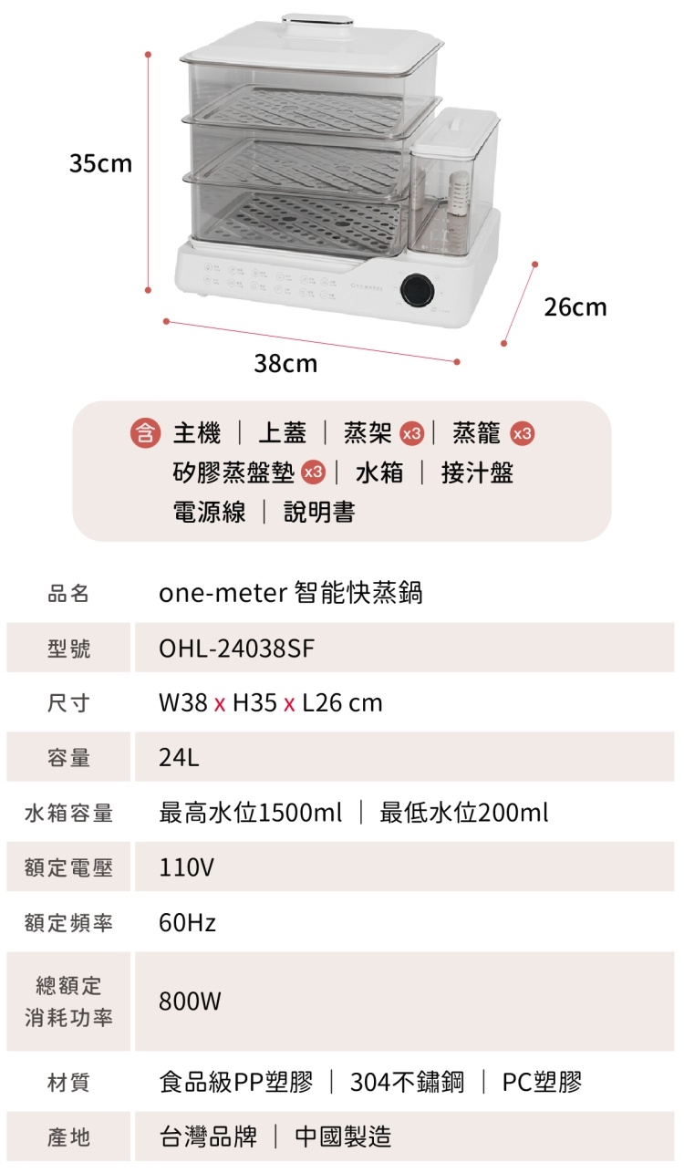 ◎配件:主機x1(含蓋)、304不鏽鋼蒸盤x3、透明蒸籠x3、接水盤x1、水箱(含蓋)x1、