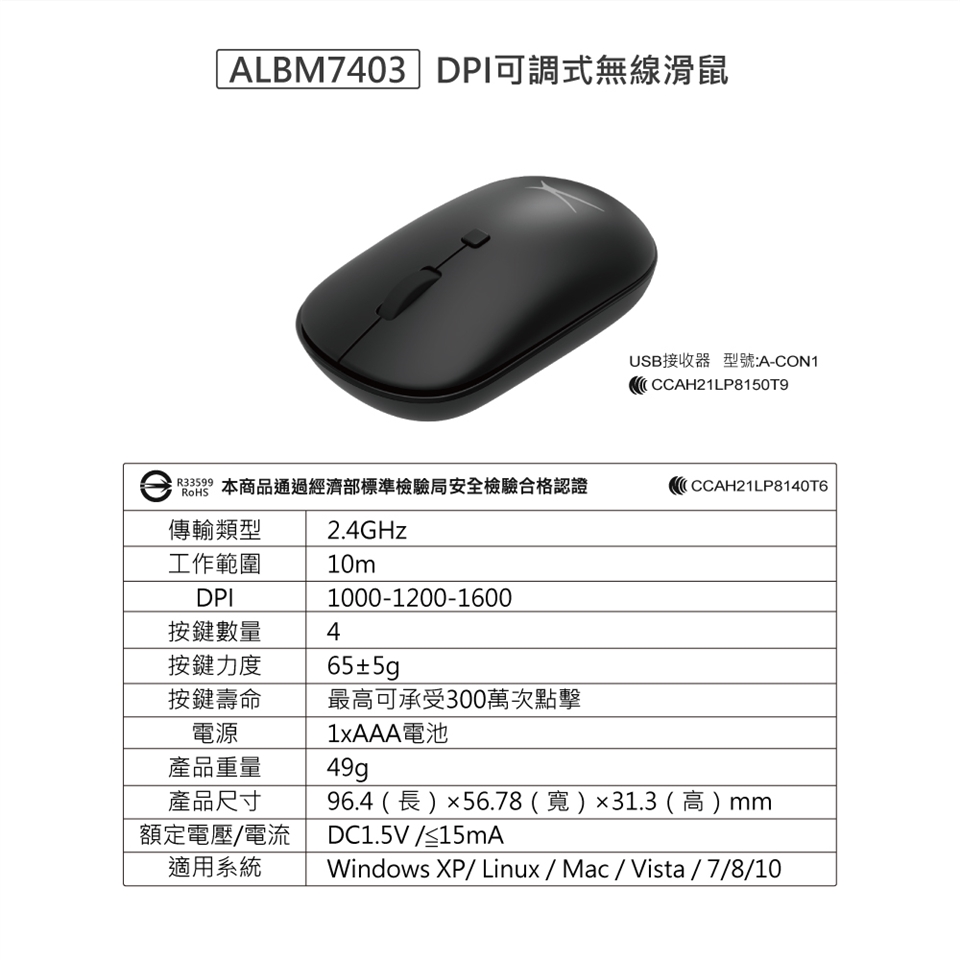 ALTEC LANSING DPI可調式無線滑鼠 ALBM7403 (白/黑/青/綠/粉)