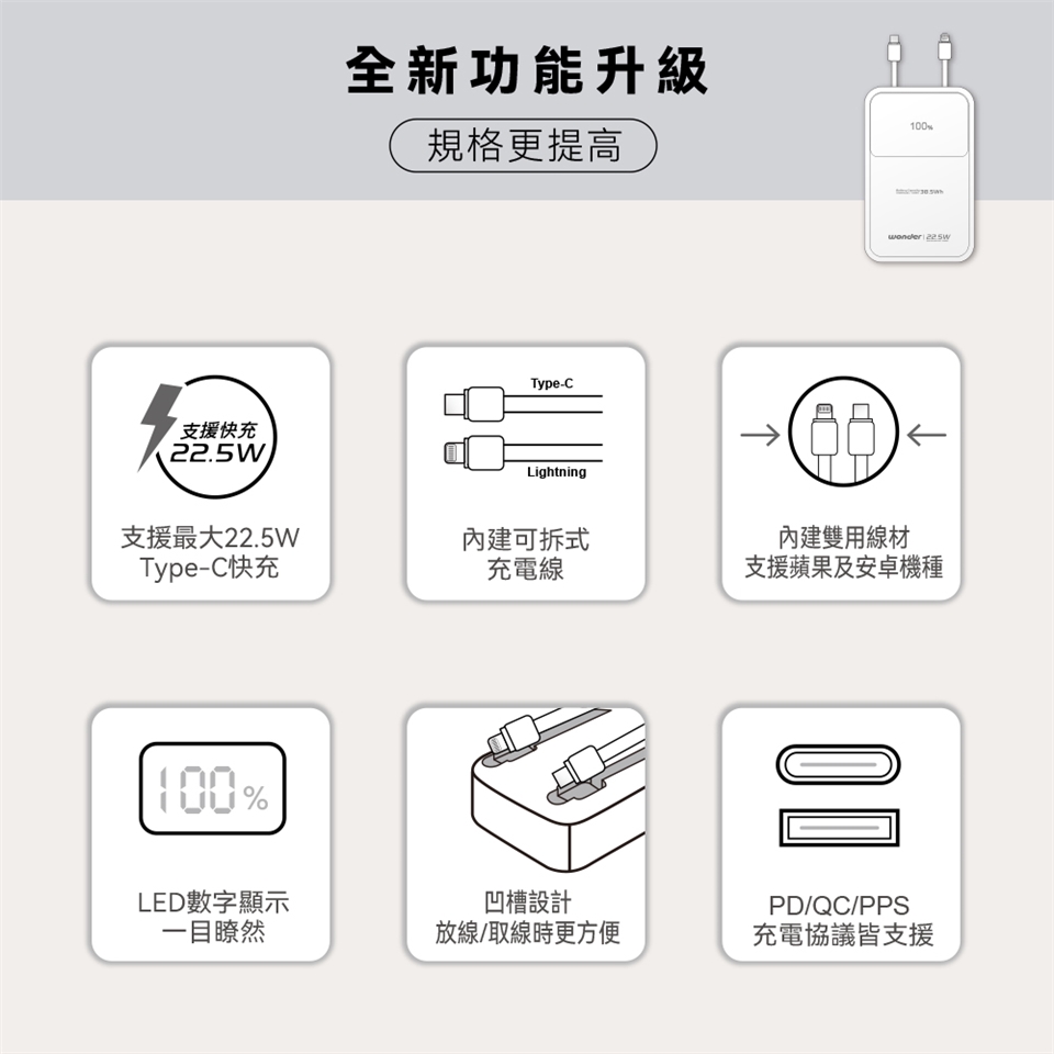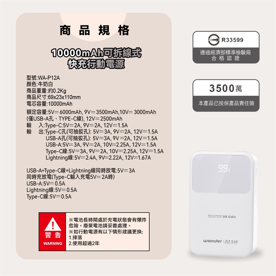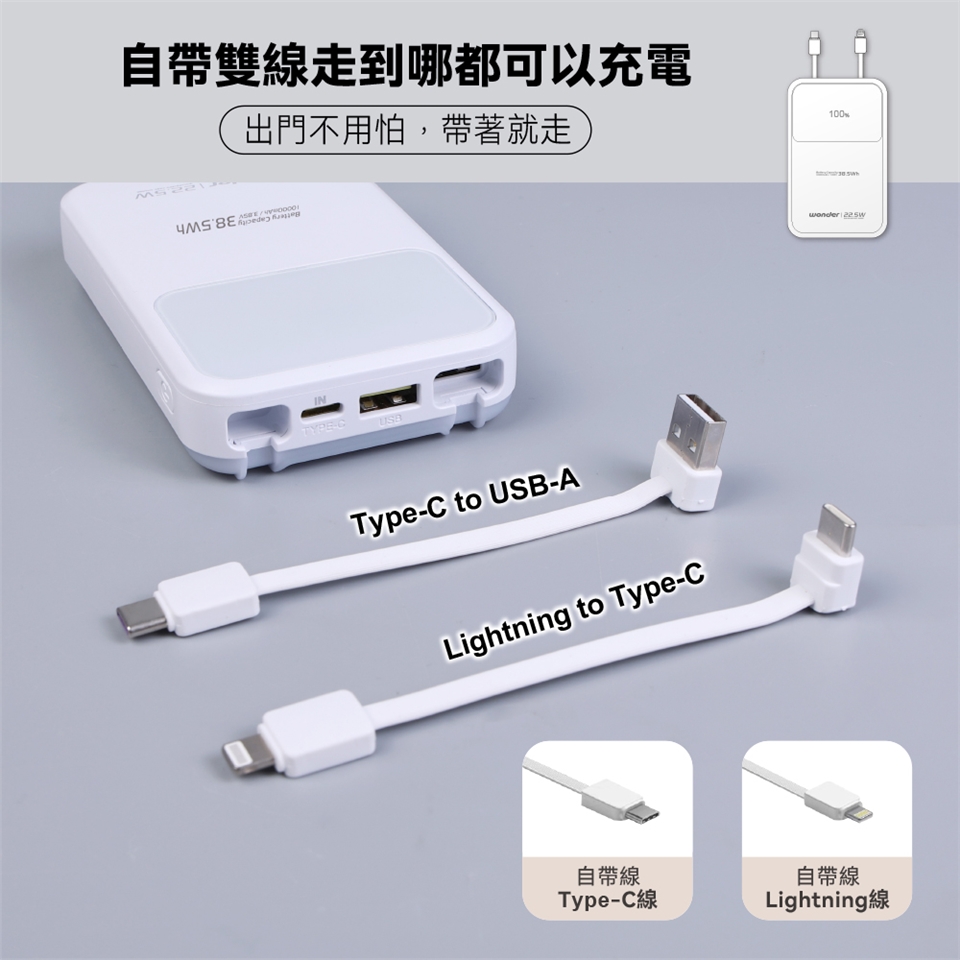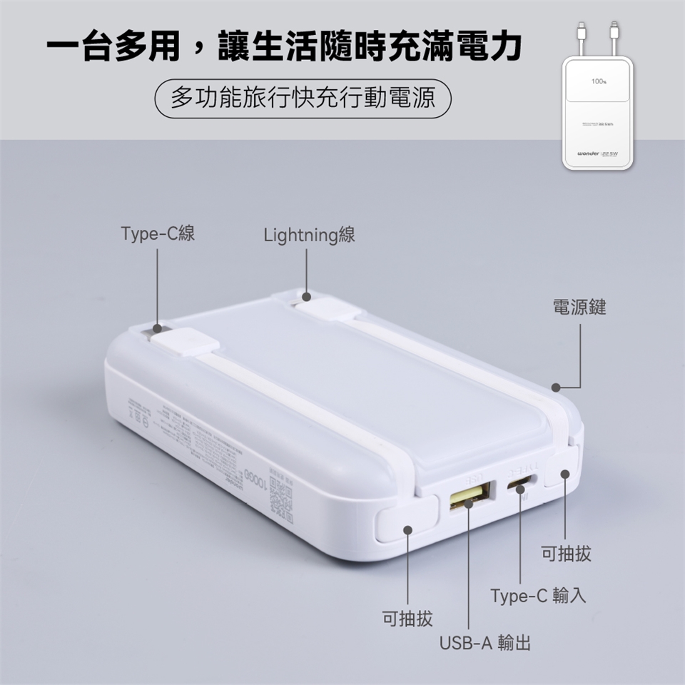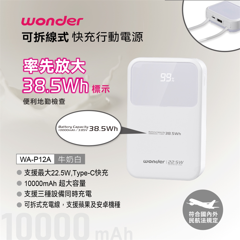 | WONDER 可拆線式快充行動電源(10000)白 WA-P12A |