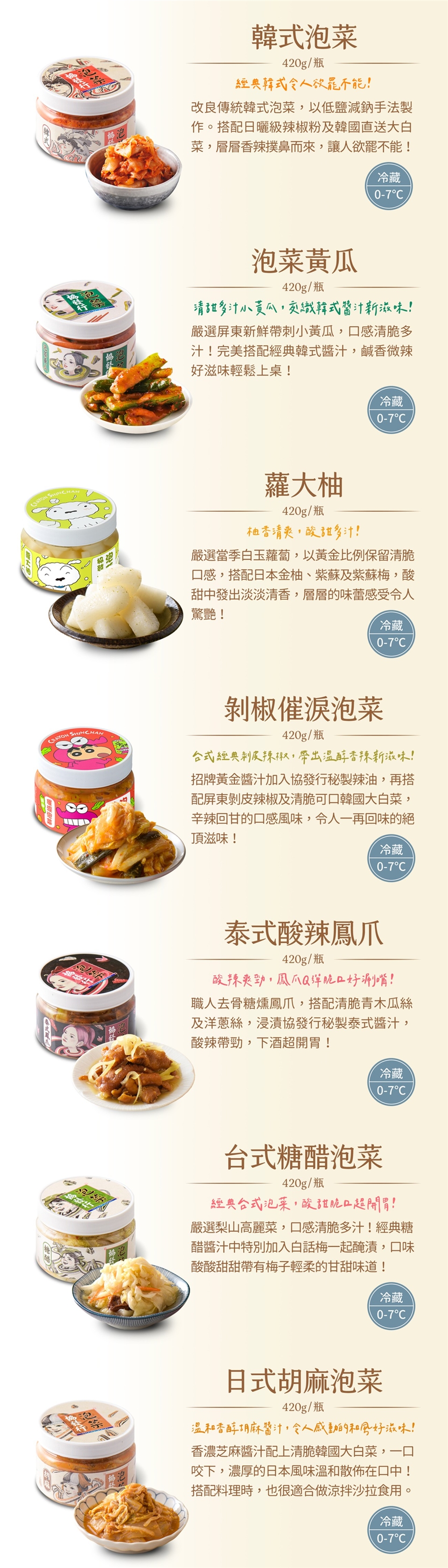 可以冷食當小菜、拌飯拌麵、煮湯煮火鍋等多種料理,除了可以直接當作開胃菜以外,泡菜更可以煮韓國泡菜鍋、泡菜炒豬肉(牛肉)、還可以搭配涼麵變成美味涼麵、多種吃法,超級方便 !