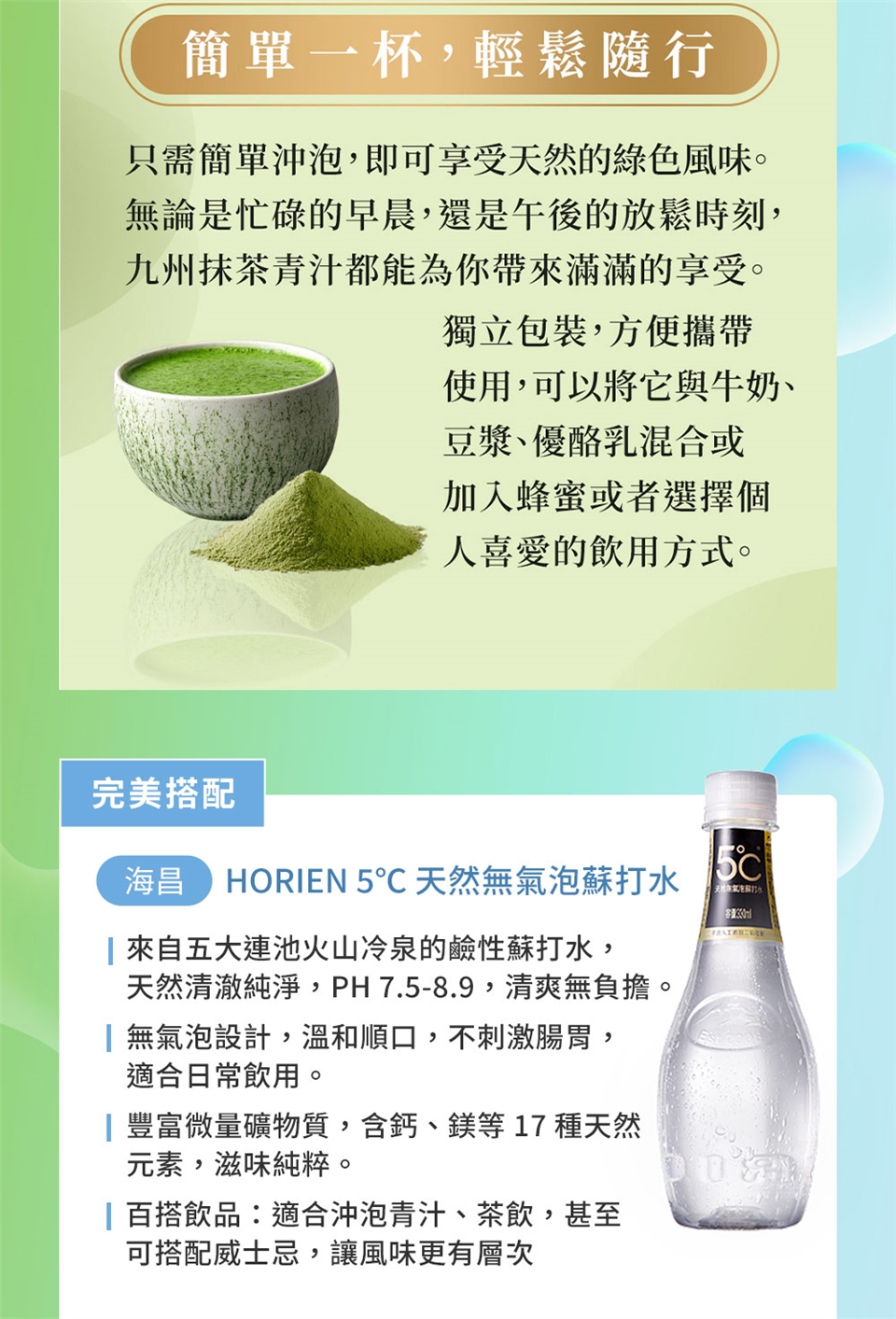 ■ 完美融合,自然契合:青汁搭配弱鹼無氣泡蘇打水,清爽純淨。