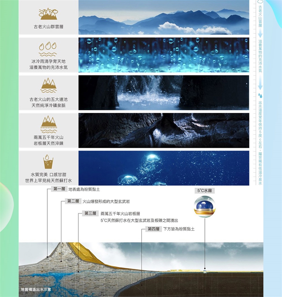 來自五大連池火山冷泉的鹼性蘇打水,天然清澈純淨,pH 7.5-8.9,清爽無負擔。