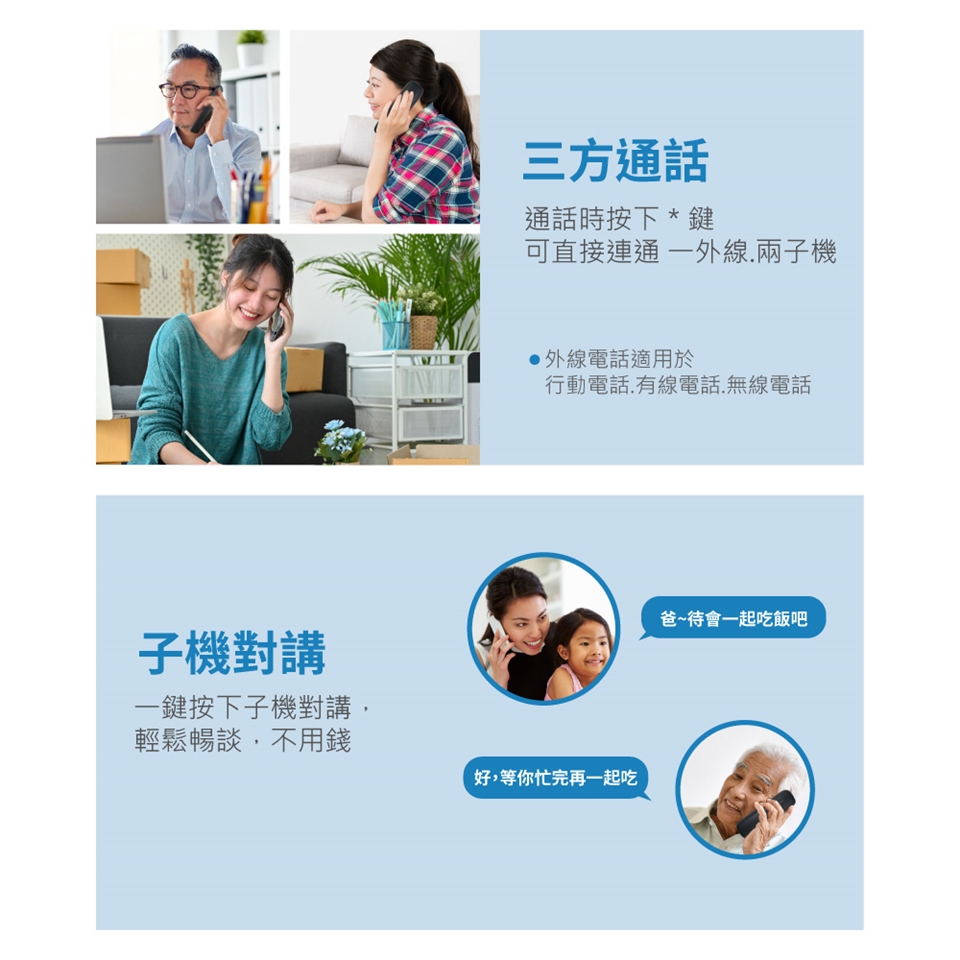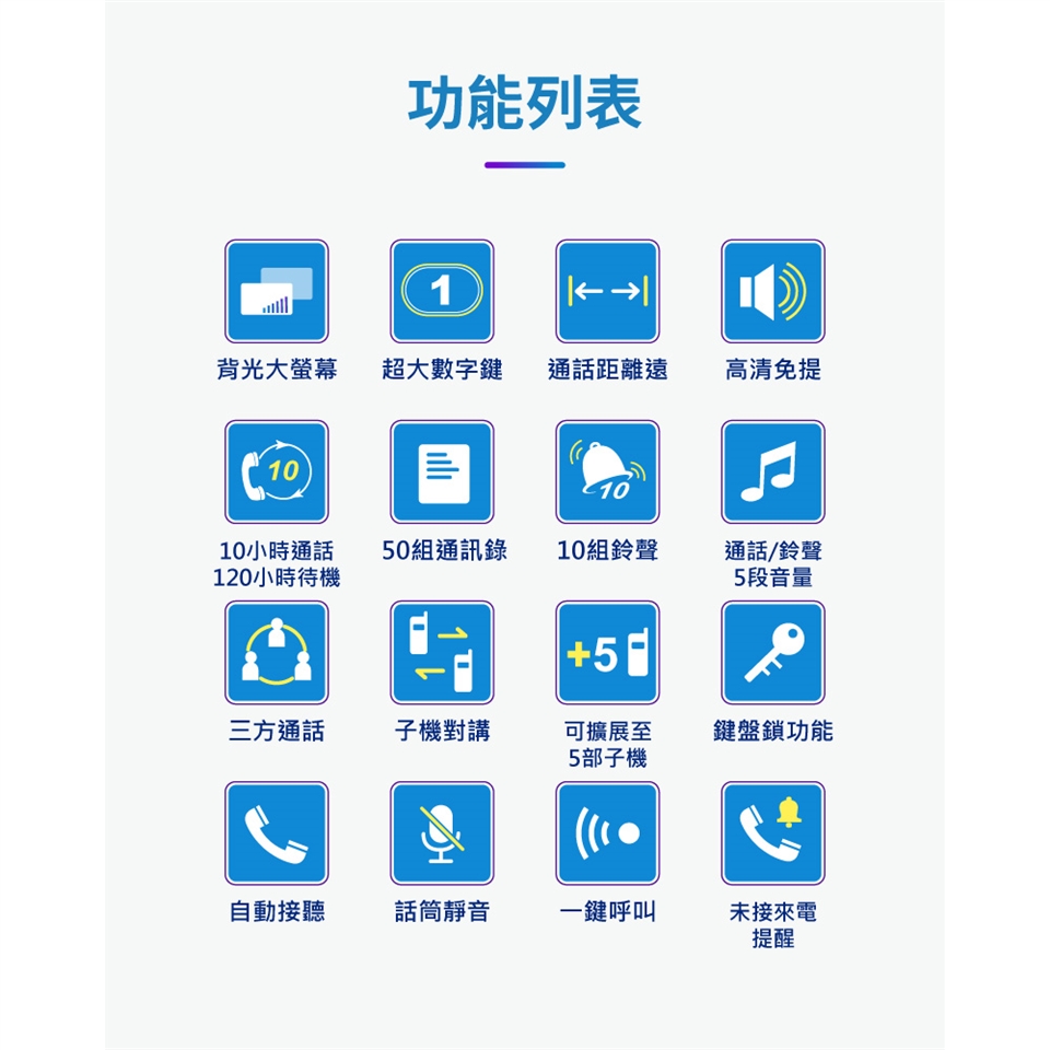 配件清單:子機*1、主機*1、電話線*1、充電器*1、說明書(含保卡)*1、充電電池*2