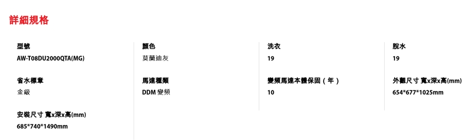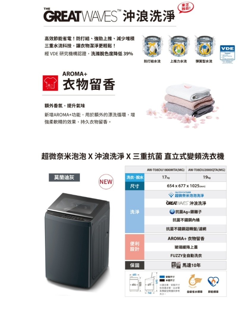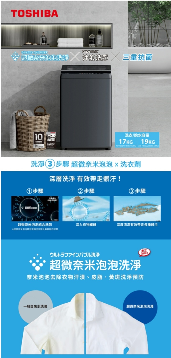 TOSHIBA 東芝 19公斤超微奈米泡泡沖浪洗淨變頻洗衣機 (AW-T08DU2000QTA(MG))