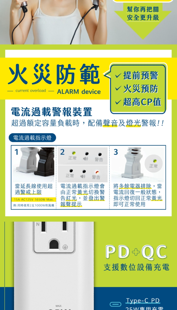 ◆ 超過額定容量負載時,警示燈會自動從”正常”黃光切換成紅光”警告”,並發出過載警報聲。此時請將多餘電器拔除,待電流回歸一般狀態,警示燈切換回”正常”黃光即可正常使用