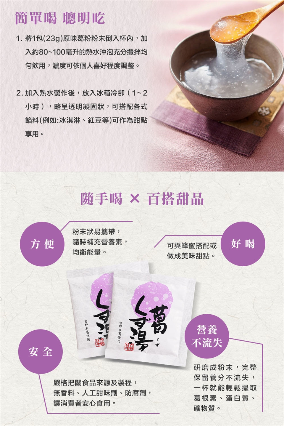 1.將1包(23g)原味葛粉粉末倒入杯內,加入約80~100毫升的熱水沖泡充分攪拌均勻飲用,濃度可依個人喜好程度調整。