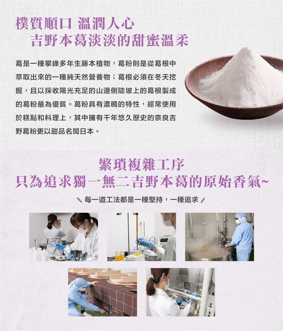 在繁複工序的行進間來去百回千次,辛勤了臂膀、揮盡了汗流,忠於吉野本葛原味,研磨淬鍊,檢測不懈,只為成就『安全、安心、美味』獨一無二的品牌初衷。