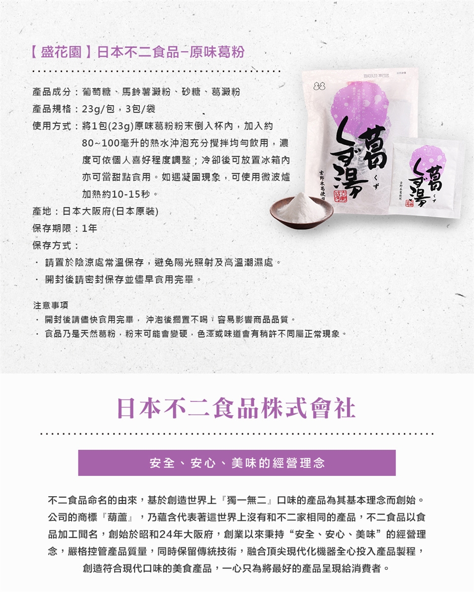 2.食品乃是天然葛粉,粉末可能會變硬,色澤或味道會有稍許不同屬正常現象。