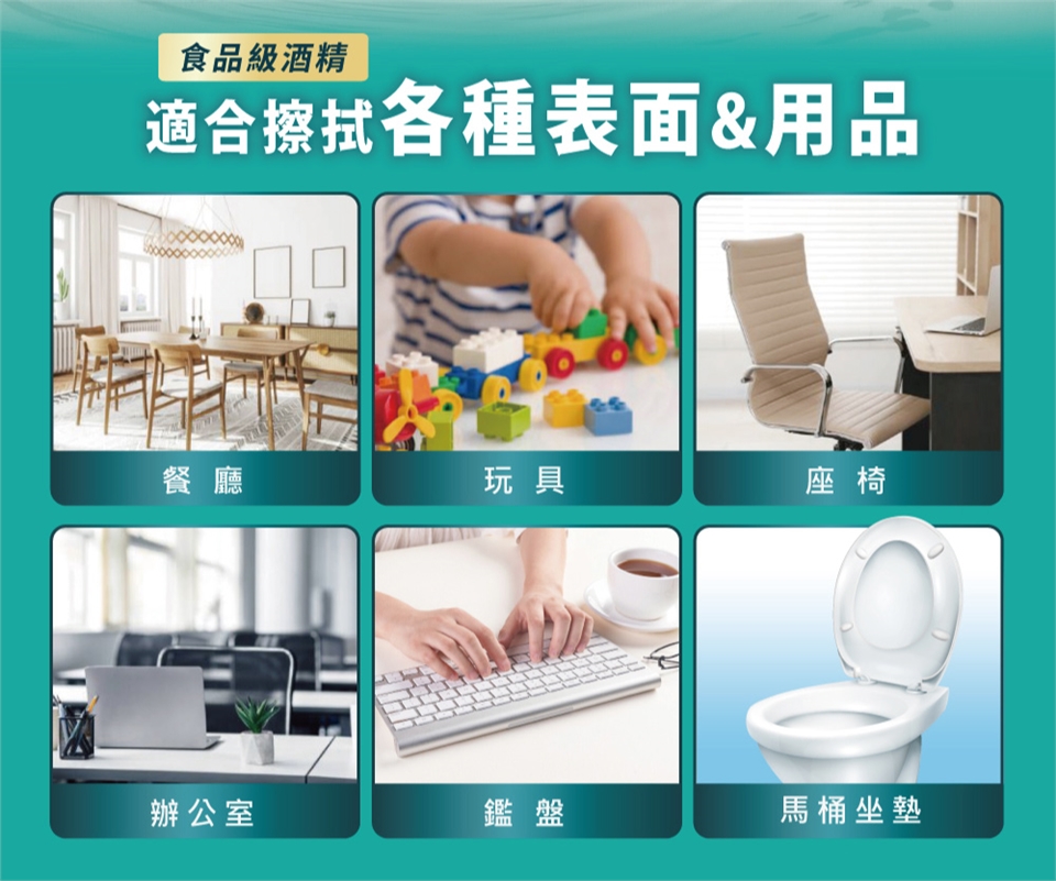 1. 瞬效殺菌:添加德國默克食品級酒精,擦拭物品表面,隨時清潔更安心。