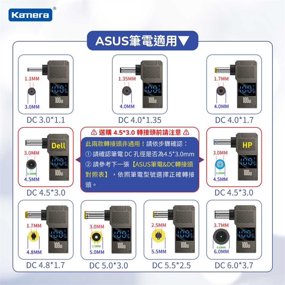 ※DC 4.5*3.0*0.6-Dell/ASUS轉接頭確認可使用型號:X1502ZA、X1405、M3500QC。