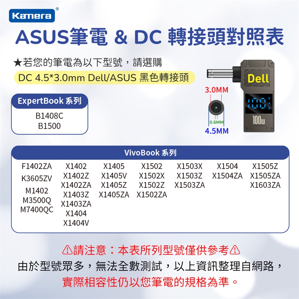 ※ASUS Vivobook 部分型號不支援DC 4.5*3.0*0.6-Dell/ASUS轉接頭:X1402ZA、X1403ZA、X1404V、X1405V、X1406、X1502、X1503X、1504、X1603ZA、M1402、M3500Q、M7400QC、F1402ZA、K3605ZV、B1500、B1408C,以上型號請改選 4.5*3.0mm DELL款。