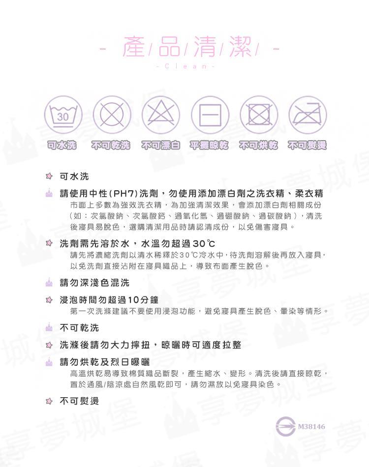 .建議清洗方式:將水置入洗衣機倒入中性清潔劑,再放入寢具商品,以弱速水洗與弱速脫水,自然風乾即可。