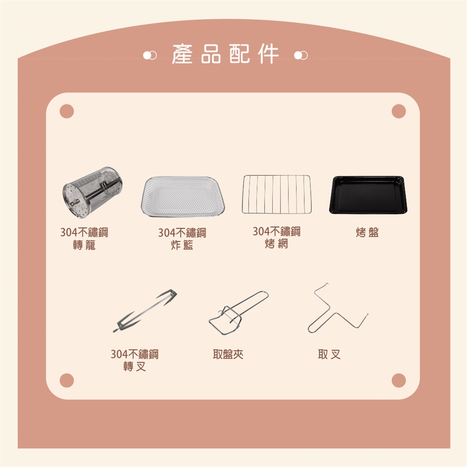 配件: 304不鏽鋼轉籠、304不鏽鋼炸籃、304不鏽鋼烤網、烤盤、304不鏽鋼轉叉、取盤夾、取叉