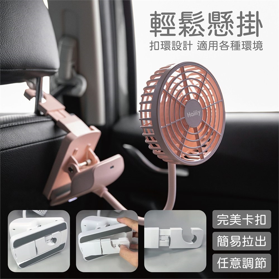 - 將Haiiiy輕奢美學夾掛兩用扇夾掛於車內空間的任意位置,或手持使用。