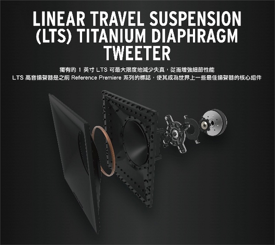高音單體:1" 鈦合金 LTS 通風高音揚聲器,帶混合橫截面擴展 Tractrix® 號角