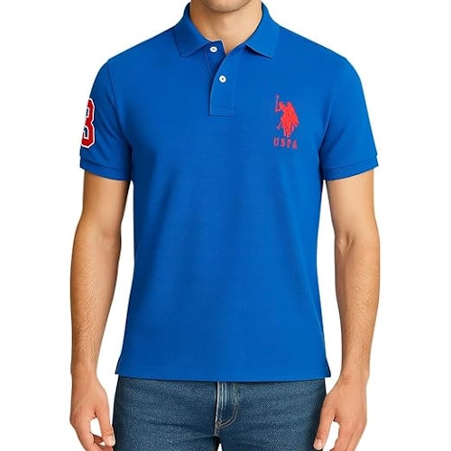 【US POLO】2025男時尚全棉大馬球標誌合身鈷藍色短袖POLO