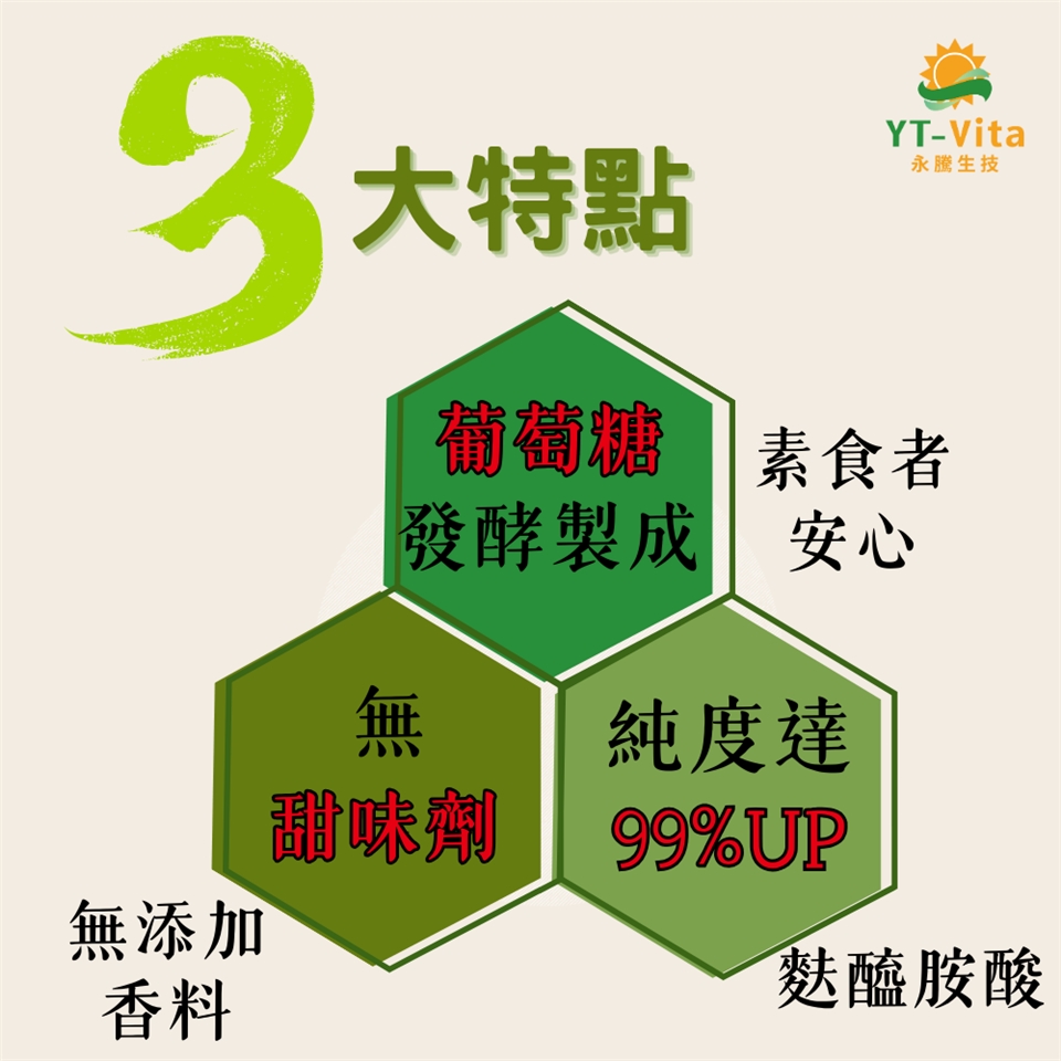 ✔ 無添加香料、甜味劑、賦形劑,呈現近白色粉末,於水中溶解度佳,無特殊氣味,口感略帶甜味