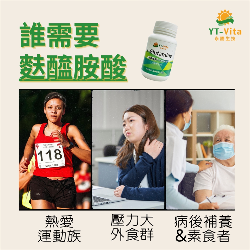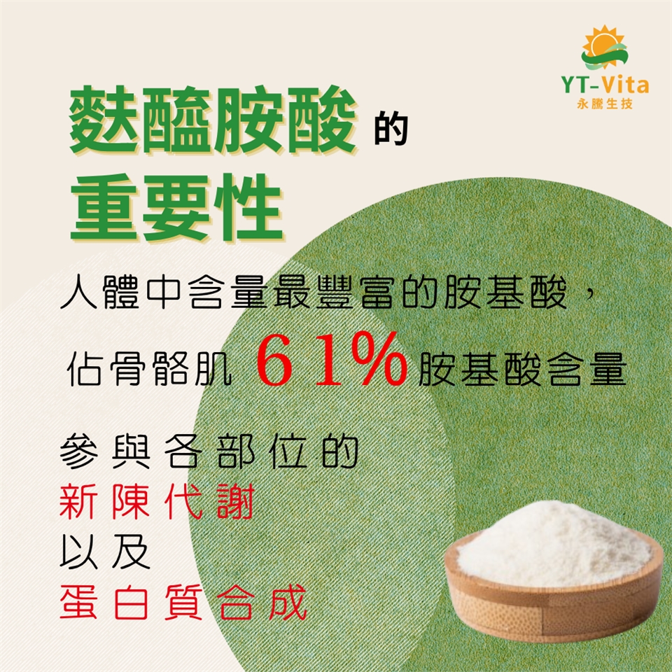 ✔ 麩醯胺酸為人體中含量最多之非必須胺基酸之一,參與蛋白質合成、各大生理機能運作所需