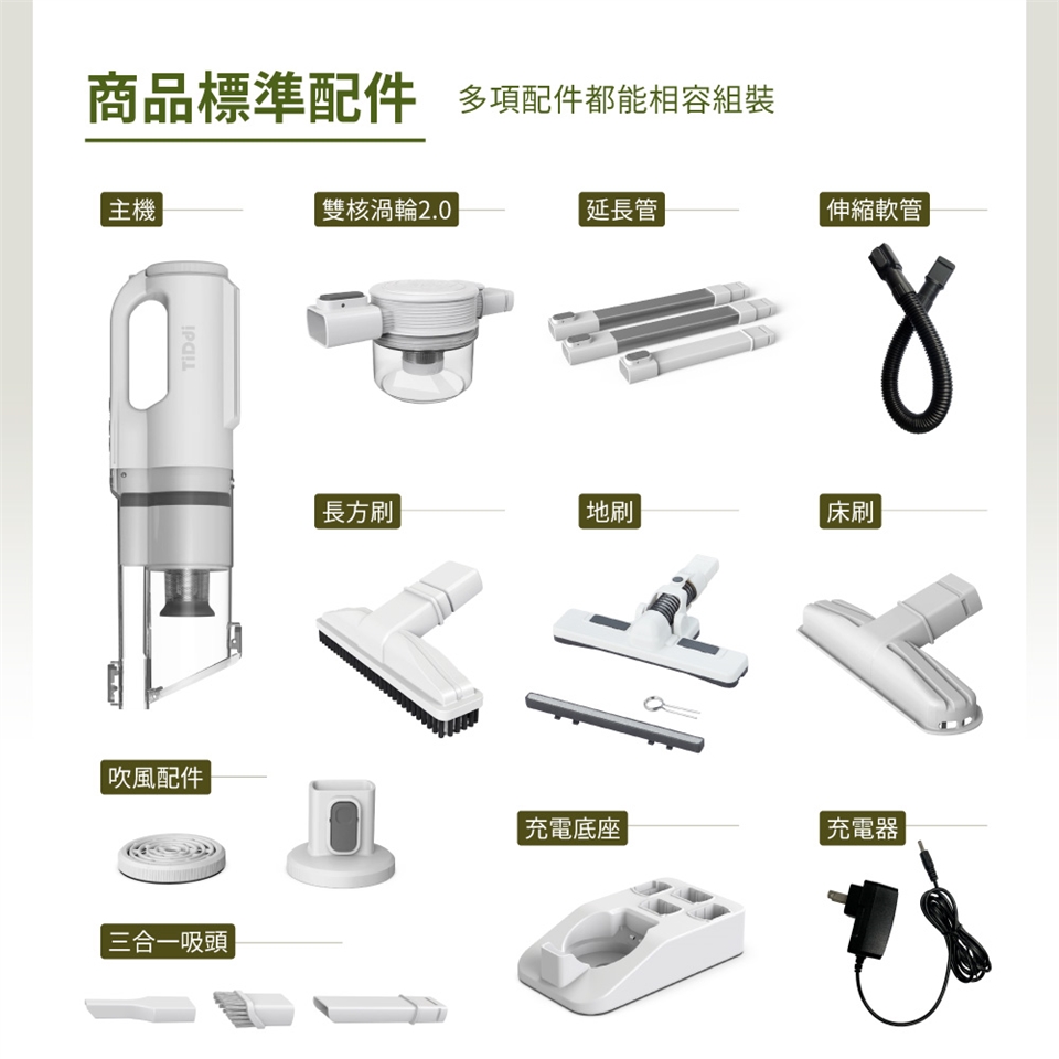 主機一台、延長管(長x2、短x1)、三合一吸頭一支、長方刷一個、床刷一個、地刷一個、伸縮軟管一個、吹風配件一個、雙核渦輪2.0一個、充電底座一個、電源充電器一個、說明書一本