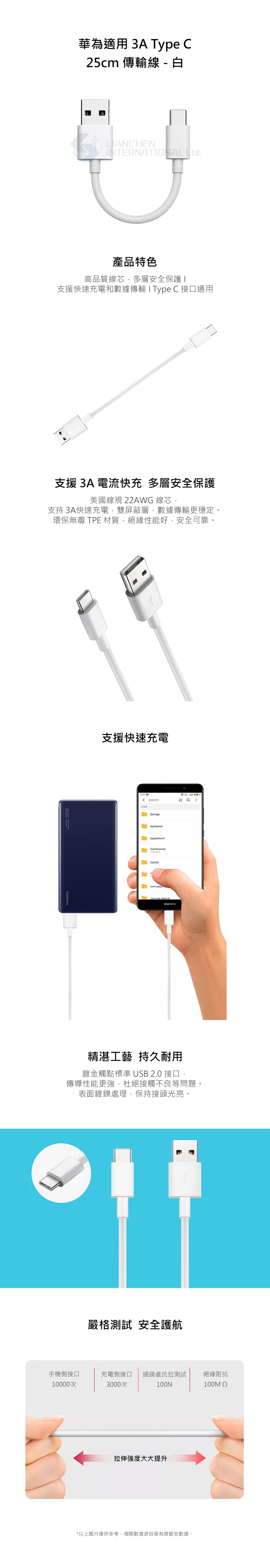 品名:HUAWEI 華為適用 25cm短版 3A USB-A to Type-C充電線