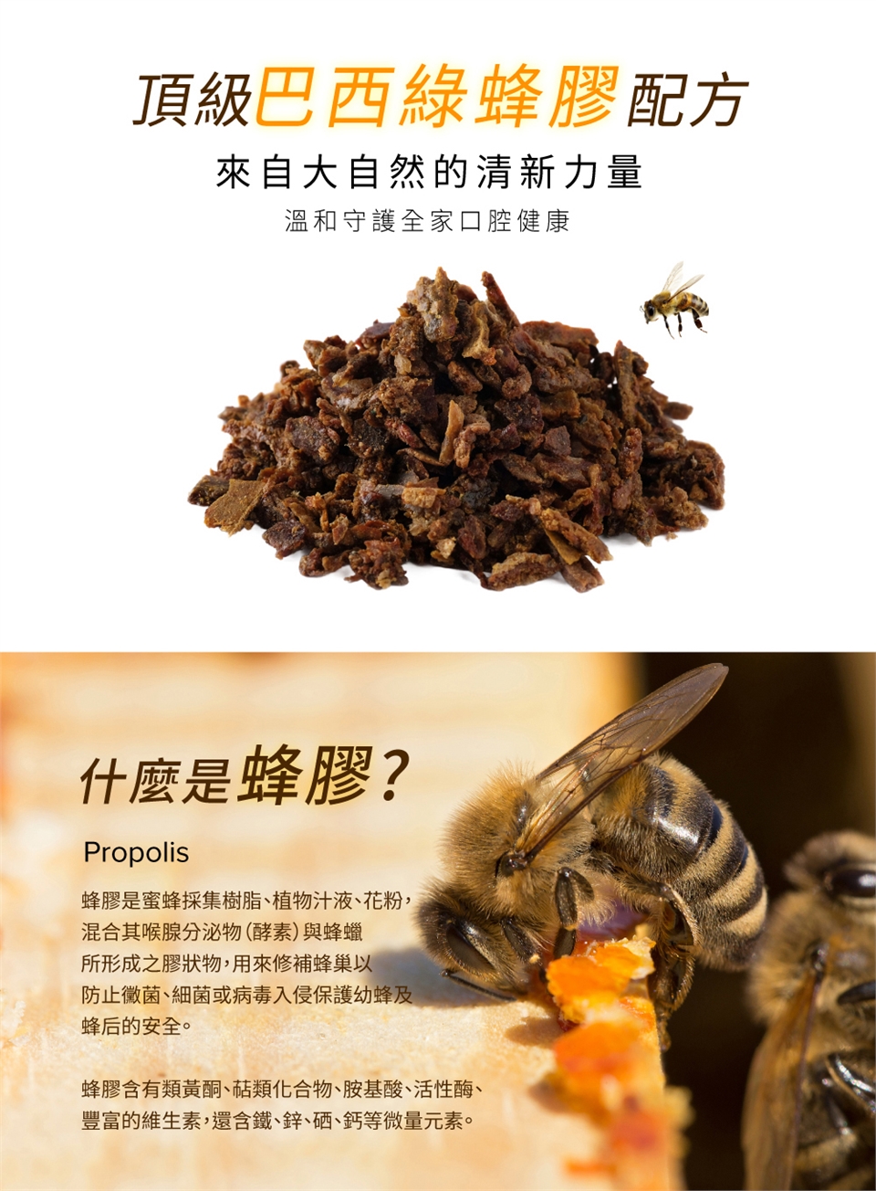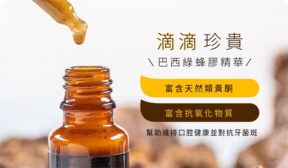 由巴西頂級綠蜂膠配方精製而成,富含天然類黃酮和抗氧化物質。