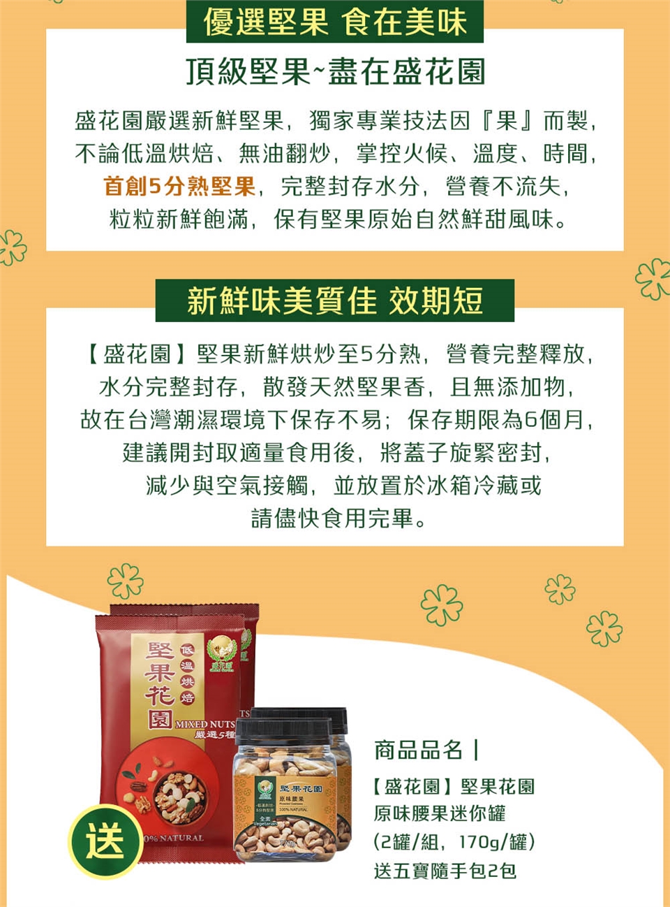 盛花園嚴選新鮮堅果,獨家專業技法因『果』而製,不論低溫烘焙、無油翻炒,掌控火候、溫度、時間,首創5分熟堅果,