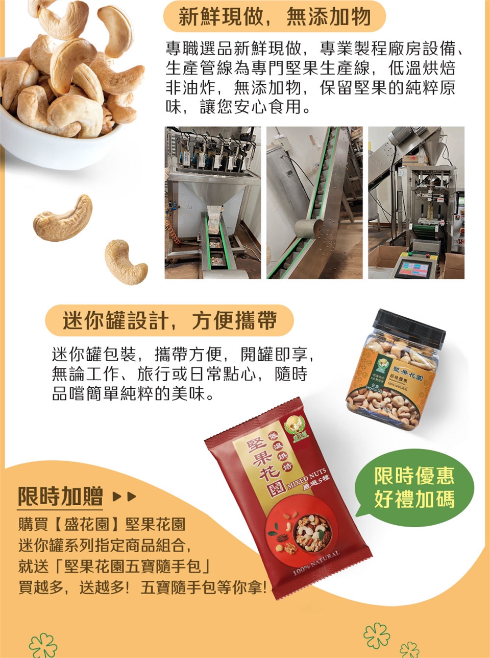 專職選品新鮮現做,專業製程廠房設備、生產管線為專門堅果生產線,低溫烘焙非油炸,無添加物,保留堅果的純粹原味,讓您安心食用。