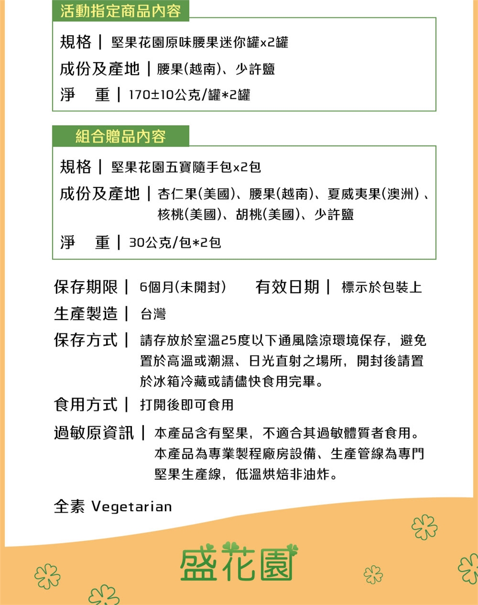 1.本產品含有堅果,不適合其過敏體質者食用。本產品為專業製程廠房設備、生產管線為專門堅果生產線,低溫烘焙非油炸。