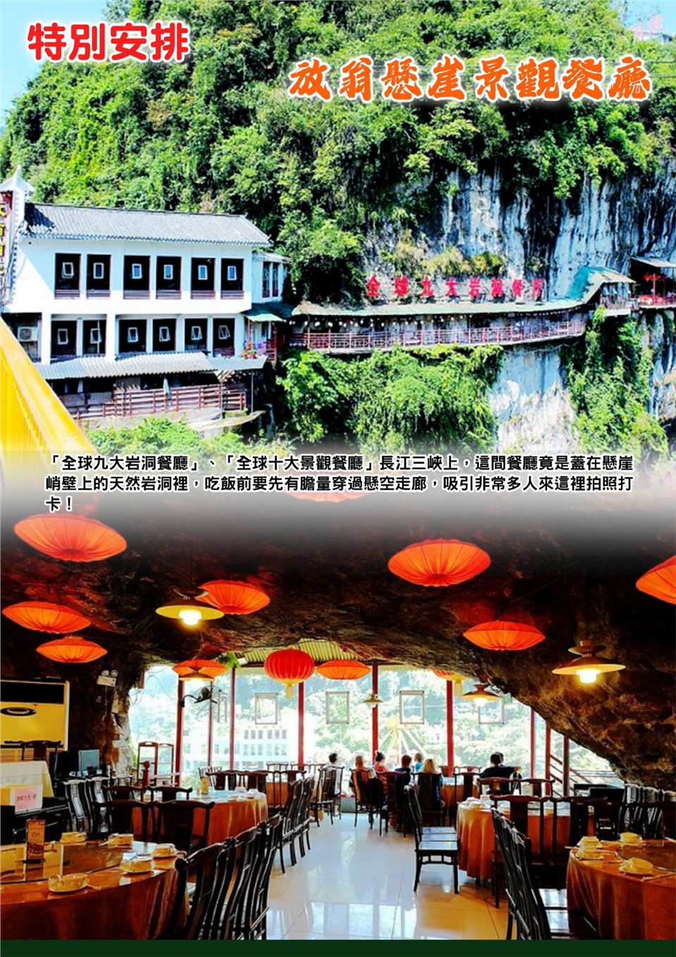 【搭三峽豪華郵輪遊(兩壩一峽)】乘豪華遊輪、過葛洲壩船閘、賞絕版三峽西陵峽、觀雄偉三峽大壩。指的是從三峽大壩至葛洲壩中間長達37公里的長江航道上的天然大峽穀~西陵峽東段,由於三峽大壩的新建,自三峽大壩以上的西陵峽西段、整個的巫峽和瞿塘峽都被淹沒、水位抬高60~100多米,部分三峽原有的景觀會有所改變,唯有兩個大壩中間〝兩壩一峽區域〞的西陵峽段保持原汁原味的長江三峽峽穀風光風貌。 【特別安排-放翁懸崖景觀餐廳】「全球九大岩洞餐廳」、「全球十大景觀餐廳」長江三峽上,這間餐廳竟是蓋在懸崖峭壁上的天然岩洞裡,吃飯前要先有膽量穿過懸空走廊,吸引非常多人來這裡拍照打卡!相傳是南宋詩人陸遊(號放翁)曾到此地飲酒作詩,故為由命名。站在岩洞外的露臺上放眼望去,那西陵峽口與下牢溪的壯麗風光,都能盡收眼底。 【女兒城】世間男子不二心,天下女兒第一城!恩施土家女兒城,是全國土家族文化集聚地,也是武陵地區城市娛樂消費中心和旅遊集散地,旨在打造中國西部首家文化旅遊商業古鎮、中國的相親之都。仿古與土家吊腳樓相結合,完美的體現了土家族的民風民俗。 早餐:酒店內 午餐:放翁餐廳 晚餐:摔碗酒特色風味 |