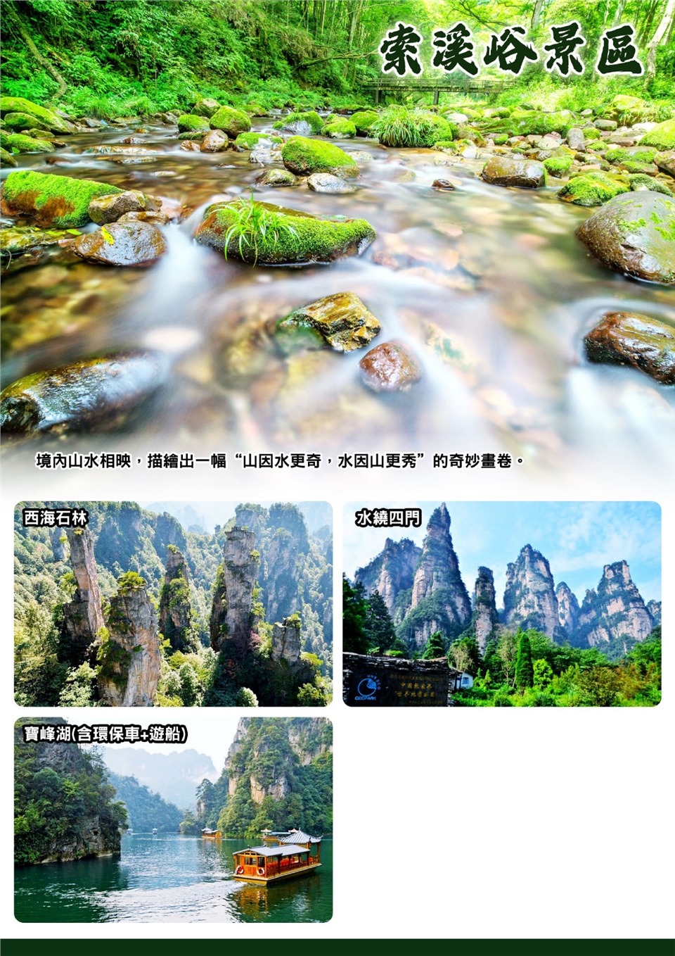 【墨戎苗寨】全村由13個苗寨組成。“墨戎”為苗語,意為“有龍的地方”。墨戎苗寨的苗族風情、苗族文化藝術主要有:苗族服飾銀飾、苗族刺繡、苗族建築、苗族趕秋、苗歌、四方鼓、蕩秋千、舞獅耍龍、上刀梯下火海、巫儺絕技等。被授予為“中國非物質文化遺產傳承基地”“中國民間文化藝術之”。 【索溪峪景區】境內山水相映,描繪出一幅“山因水更奇,水因山更秀”的奇妙畫卷。 ◆西海石林:為一盆地型峽谷峰林地貌,位於索溪峪景區的西部,有“峰海”之稱。“海”中石峰林立,千姿百態,林木蔥蘢茂密。春夏或秋初,若雨後初晴,則雲如浪濤,或湧流,或奔瀉,鋪天蓋地,極為壯觀。峰海、林海和雲海合一,即為西海之特色。 ◆寶峰湖(含環保車+遊船):景區以其秀麗的湖光水色與險峻的山崖古寨,成為武陵源水景風光的代表之作。乘著遊船,一邊聽講解員介紹兩岸之奇峰靈石,一邊享受湖上吹來的清爽涼風,分外寫意。遊船過程中,有穿著民族服裝的「阿哥」、「阿妹」走出船艙,與遊船上的講解員或遊客,作情歌對唱。 ◆水繞四門:因金鞭溪、礦洞溪、鴛鴦溪、龍尾溪四條溪流在這塊不足200平方米的山谷盆地裡盤繞匯流而得名。置身其中,但見“水在山間流,人似水中游”,可稱天下絕景。 早餐:酒店內 午餐:長龍宴 晚餐:娃娃魚宴 |