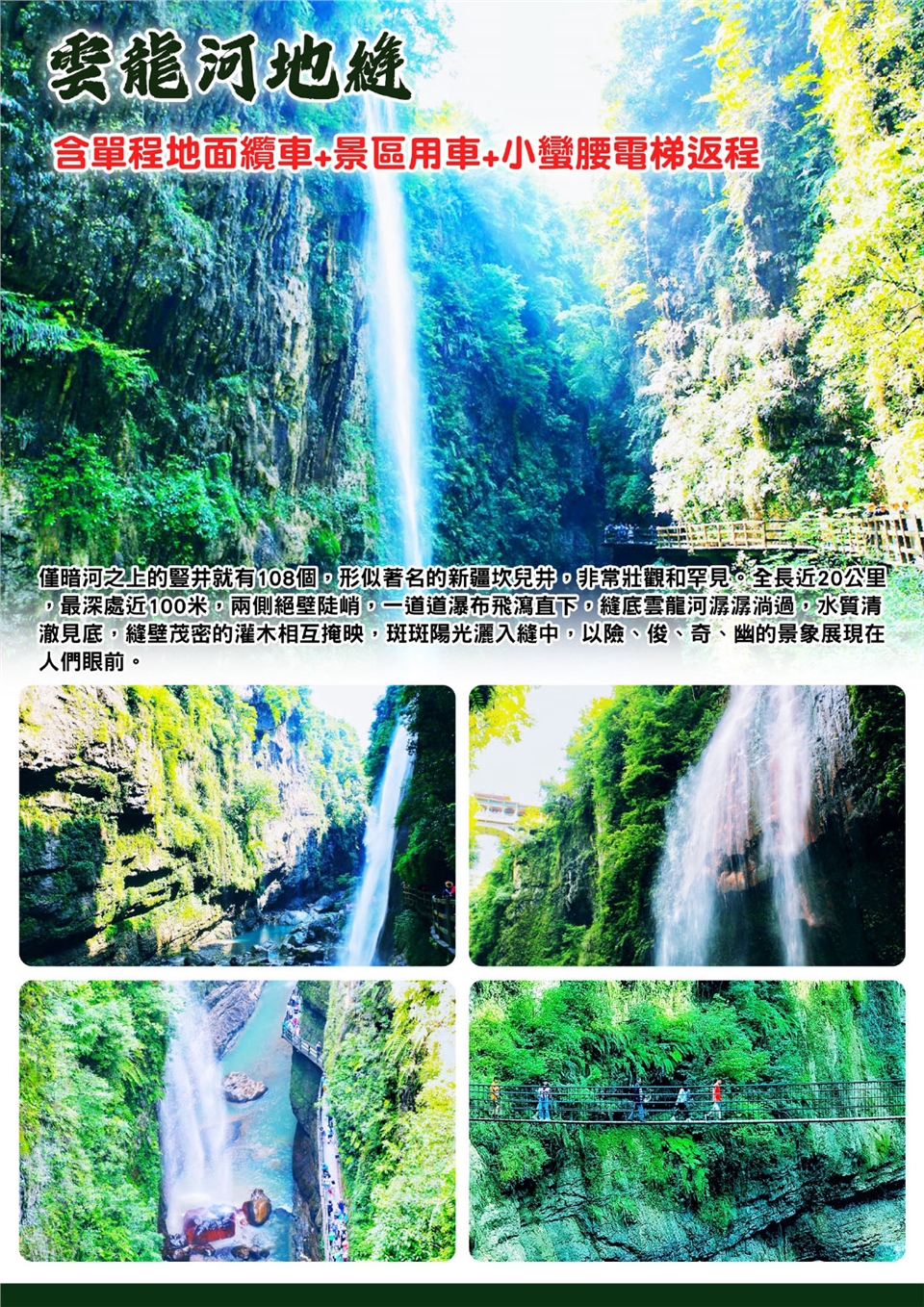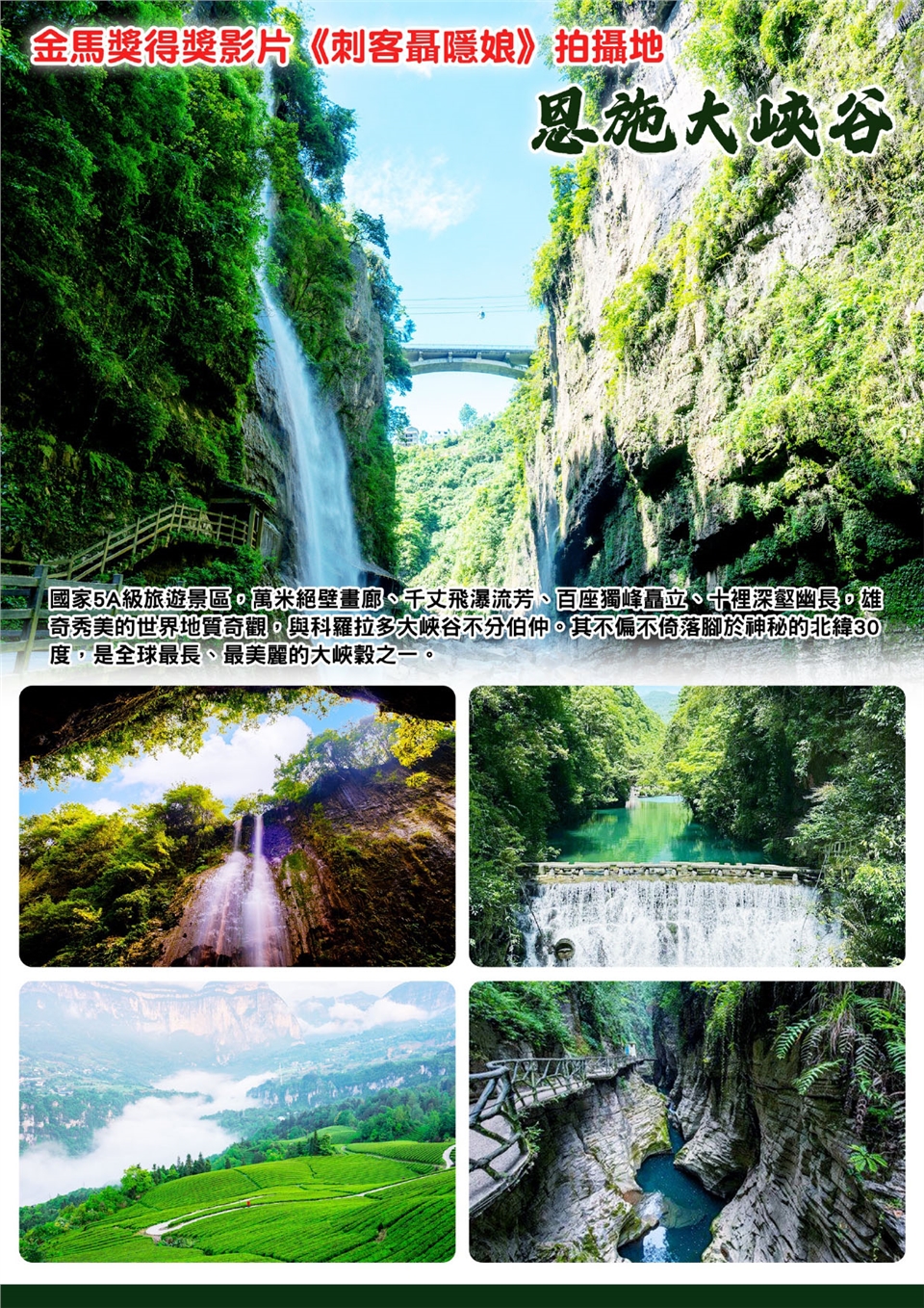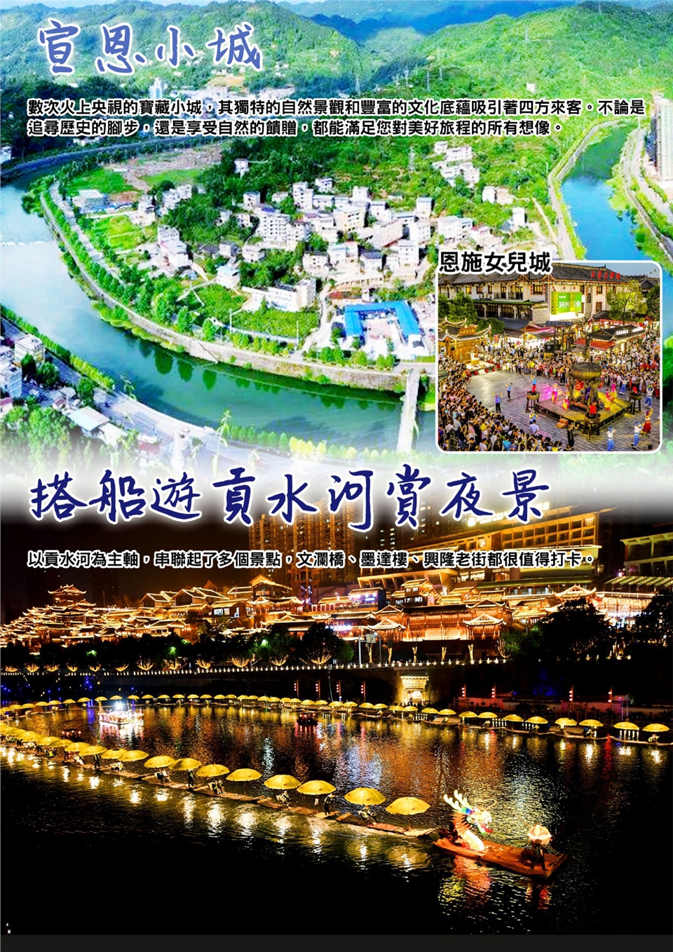 【恩施大峽谷】金馬獎得獎影片《刺客聶隱娘》拍攝地國家5A級旅遊景區,萬米絕壁畫廊、千丈飛瀑流芳、百座獨峰矗立、十裡深壑幽長,雄奇秀美的世界地質奇觀,與科羅拉多大峽谷不分伯仲。其不偏不倚落腳於神秘的北緯30度,是全球最長、最美麗的大峽穀之一。 ◆雲龍河地縫:(含單程地面纜車+景區用車+小蠻腰電梯返程)為世界之最。僅暗河之上的豎井就有108個,形似著名的新疆坎兒井,非常壯觀和罕見。全長近20公里,最深處近100米,兩側絕壁陡峭,一道道瀑布飛瀉直下,縫底雲龍河潺潺淌過,水質清澈見底,縫壁茂密的灌木相互掩映,斑斑陽光灑入縫中,以險、俊、奇、幽的景象展現在人們眼前。 【宣恩小城】數次火上央視的寶藏小城,其獨特的自然景觀和豐富的文化底蘊吸引著四方來客。不論是追尋歷史的腳步,還是享受自然的饋贈,都能滿足您對美好旅程的所有想像。 ◆搭船遊貢水河賞夜景:以貢水河為主軸,串聯起了多個景點,文瀾橋、墨達樓、興隆老街都很值得打卡。晚上遊人如織,夜景璀璨,登上高樓,一覽小城全貌,不自覺驚嘆它的美。 早餐:酒店內或餐盒 午餐:恩施風味 晚餐:來鳳風味 |