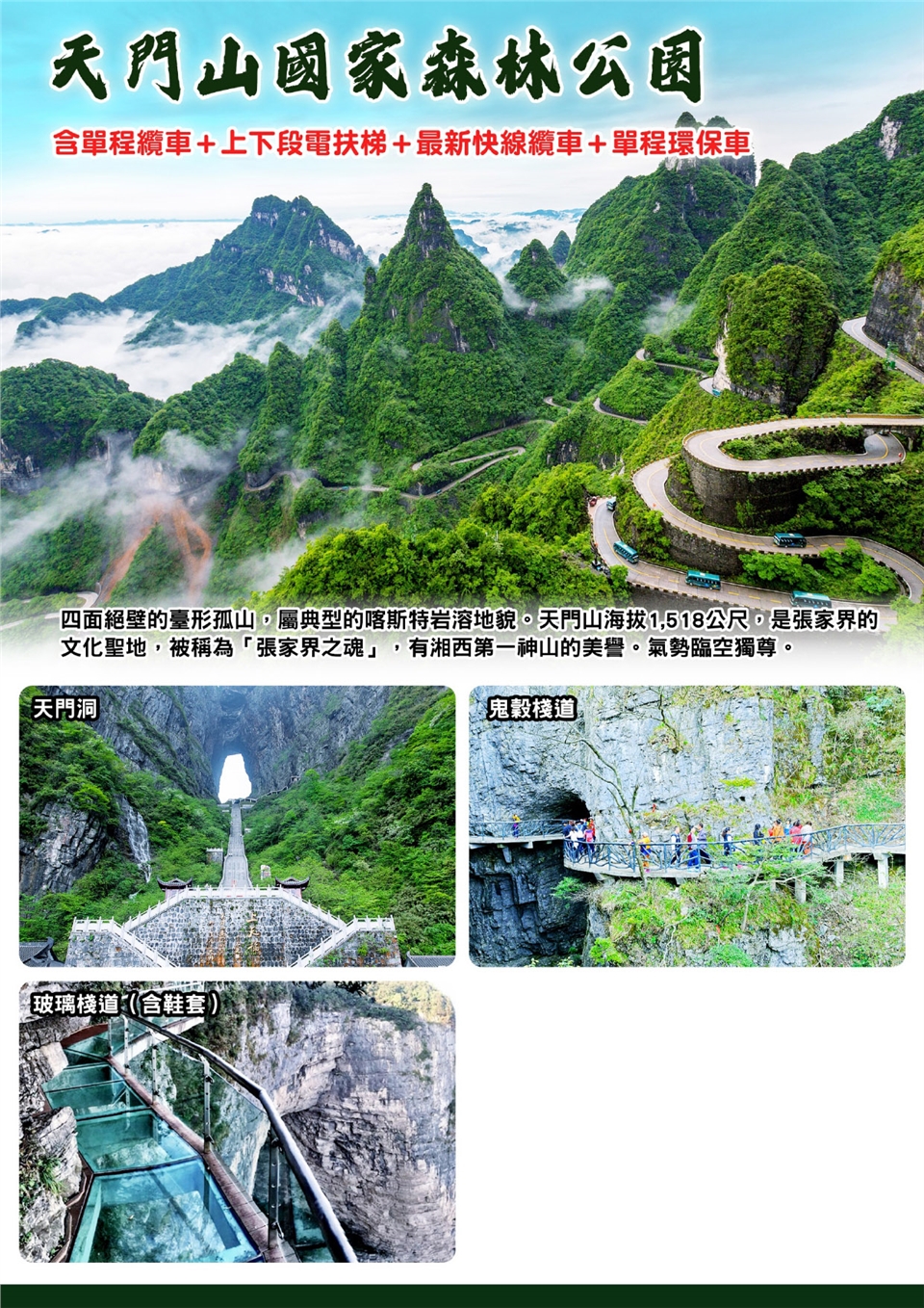 【土司城】以最完整的土家山寨舊址原貌為風格,也是土家人朝拜、祭祀、祈禱和節慶的「聖地」。園中還有土家婚俗、頭飾服飾、蠟染、織錦、銀匠、石匠以及奇石根雕等具有民族風情的物品陳列,遊客在這裡遊玩時,也可以購買到銀器、牛角梳及羅漢果等旅遊紀念品。 【天門山國家森林公園】(含單程纜車+上下段電扶梯+最新快線纜車+單程環保車)為四面絕壁的臺形孤山,屬典型的喀斯特岩溶地貌。天門山海拔1,518公尺,是張家界的文化聖地,被稱為「張家界之魂」,有湘西第一神山的美譽。氣勢臨空獨尊。 ◆天門洞:世界上最高海拔的天然穿山溶洞-天門洞。天門洞終年氤氳蒸滕,景象變幻莫測,時有團團雲霧自洞中吐納翻湧,時有道道霞光透洞而出,瑰麗神奇,宛如幻境,似蘊藏天地無窮玄機。天門洞千百年承接天地萬物的靈氣,成為人們祈福許願的靈地,被視為《天界之門》、《天界聖境》,已成為美好幸福的象徵。 ◆鬼穀棧道:因懸於鬼穀洞上側的峭壁沿線而得名,棧道全長1,600米,平均海拔為1,400米,起點是倚虹關,終點到小天門。與其他棧道不同的是,鬼谷棧道全線既不在懸崖之巔,也不在懸崖之側,而是全線都立於萬丈懸崖的中間,給人以與懸崖共起伏同屈伸的感覺。※備註:鬼穀棧道如遇大風等天氣因素則關閉,請見諒! ◆玻璃棧道(含鞋套):憑空伸出的玻璃眺望臺。這條看著就讓人腿軟的玻璃橋給人帶來的刺激震撼感可與舉世聞名的美國大峽穀玻璃走廊「天空之路」媲美。※備註:玻璃棧道如遇大風等天氣因素則關閉,請見諒! 早餐:酒店內 午餐:韓式烤肉 晚餐:土家風味 |