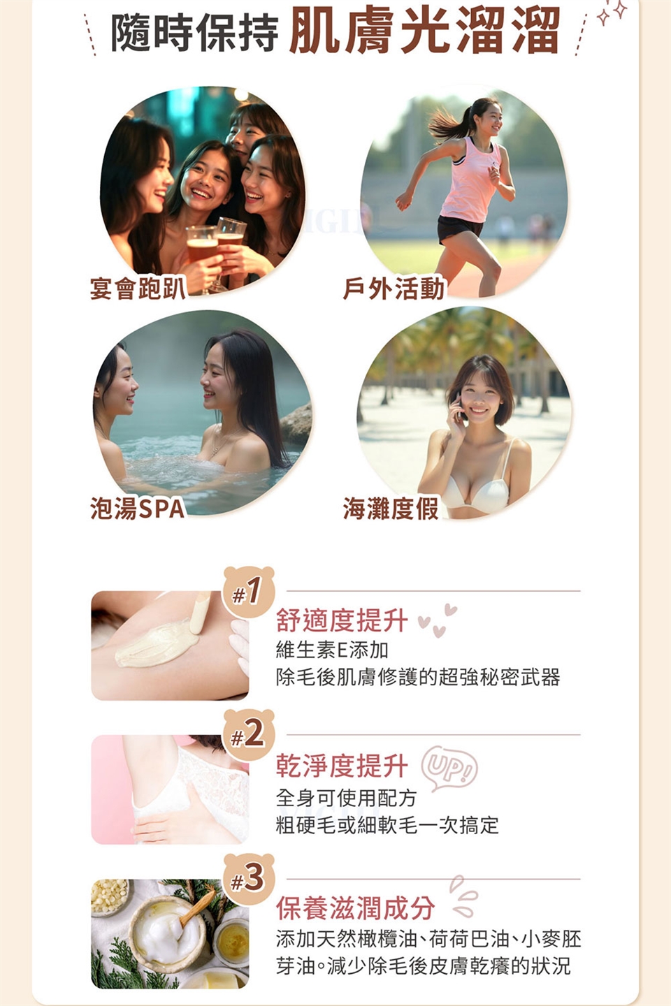 除毛凝膠使用方法:取適量塗抹於肌膚,輕輕按摩至肌膚完全吸收為止。