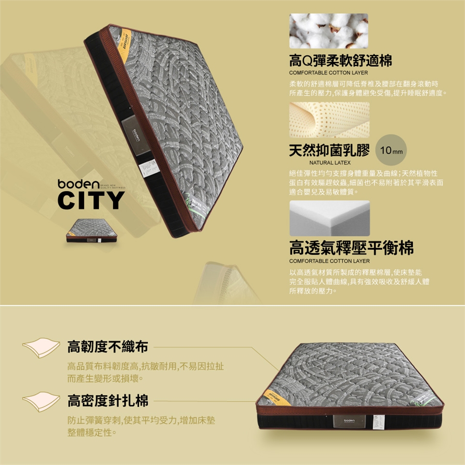 內部材質:10mm天然乳膠、高級Q彈柔軟舒適棉、高透氣釋壓平衡棉、高韌度不織布、高密度針扎棉
