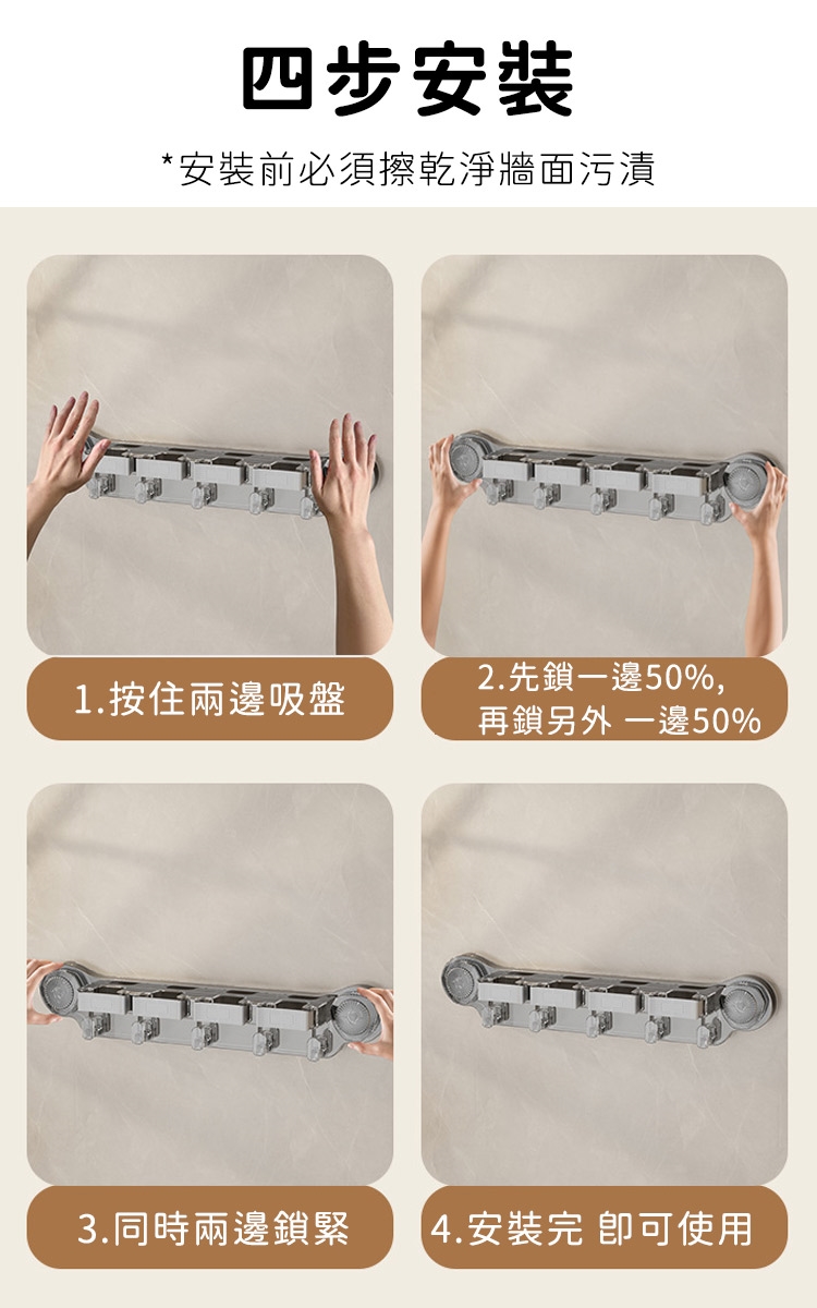 01.擦淨上牆位置-02撕下吸盤保護膜-03按壓黏貼上牆-04鎖緊開關排出空氣