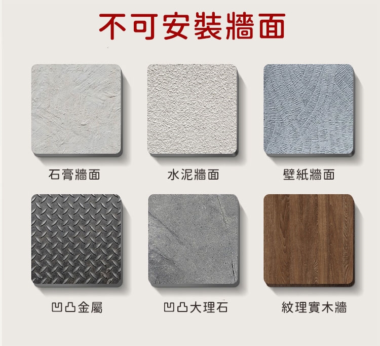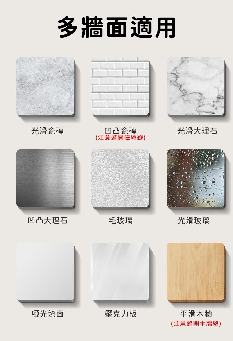 適用牆面:光滑瓷磚、粗糙瓷磚、光滑大理石、光滑玻璃、光滑金屬、實木牆面