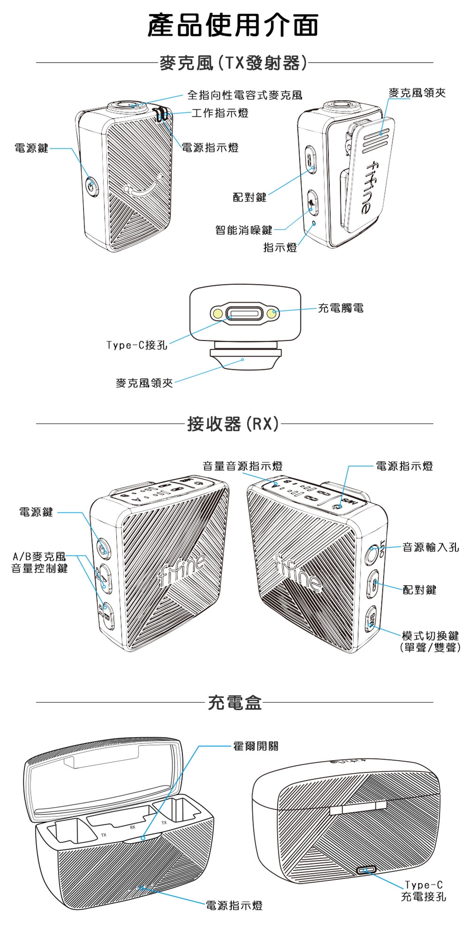 1.本產品僅包含:無線電容式麥克風TX發射器*2、RX接收器*1、充電盒*1、可拆式絨毛防風罩*2、