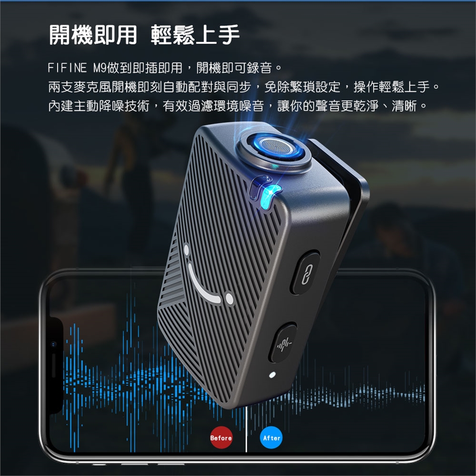 FIFINE M9使用 2.4GHz 數位傳輸技術,使用距離最遠可達50公尺,穩定連線且極低延遲,確保音訊與畫面同步不卡頓。