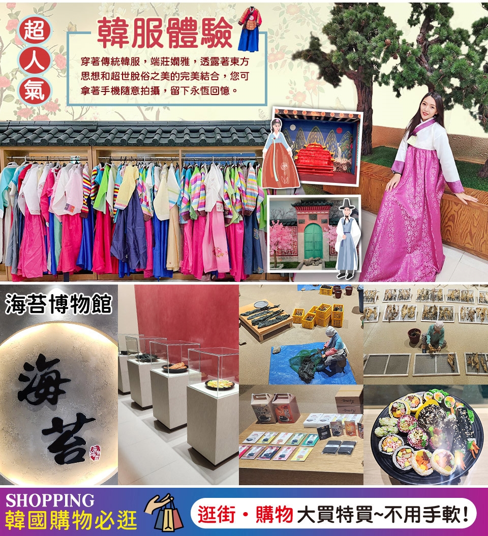 【第5天】 景福宮─韓國文化體驗營(DIY辛奇+韓式點心+韓服體驗+海苔博物館)─韓流時尚彩粧店─新塗鴉秀(含門票)─首爾明洞─超市巡禮 |